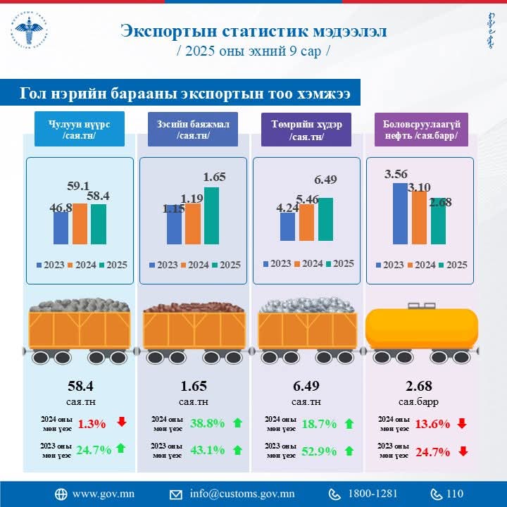 📊2025 оны эхний 9 сард Монгол улс экспортод 10.7 тэрбум ам.долларын бараа, түүхий эд гаргасан нь өнгөрсөн оны мөн үетэй харьцуулахад 1.1 тэрбум ам.доллароор буюу 9.1 хувиар буурсан байна.