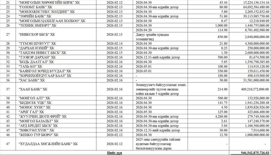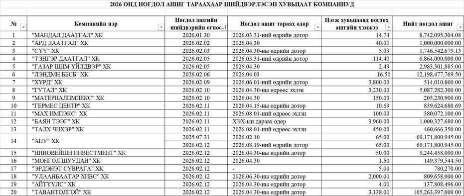 📍 2021 онд 33 компани 110.5 тэрбум, 2022 онд 38 компани 150.8 тэрбум, 2023 онд 34 компани 303.07 тэрбум, 2024 онд 47 компани 535.09 тэрбум, 2025 онд 42 компани 1,144.26 тэрбум төгрөгийн ногдол ашгийг тус тус хуваарилахаар шийдвэрлэж байсан энэ онд 47 компани болж нэмэгдсэн үзүүлэлттэй байна. Тодруулбал, “Монголын хөрөнгийн бирж” ХК-ийн I ангилалд бүртгэлтэй 21 компани 909.92 тэрбум төгрөг буюу нийт ногдол ашгийн 96.13 хувийг, II ангилалд бүртгэлтэй 19 компани 35.27 тэрбум төгрөг буюу 3.73 хувийг, III ангилалд бүртгэлтэй 6 компани 1.24 тэрбум төгрөг буюу 0.13 хувийг, биржийн бүртгэлээс хасагдсан 1 компани 0.11 тэрбум төгрөг буюу 0.01 хувийг бүрдүүлж байна.