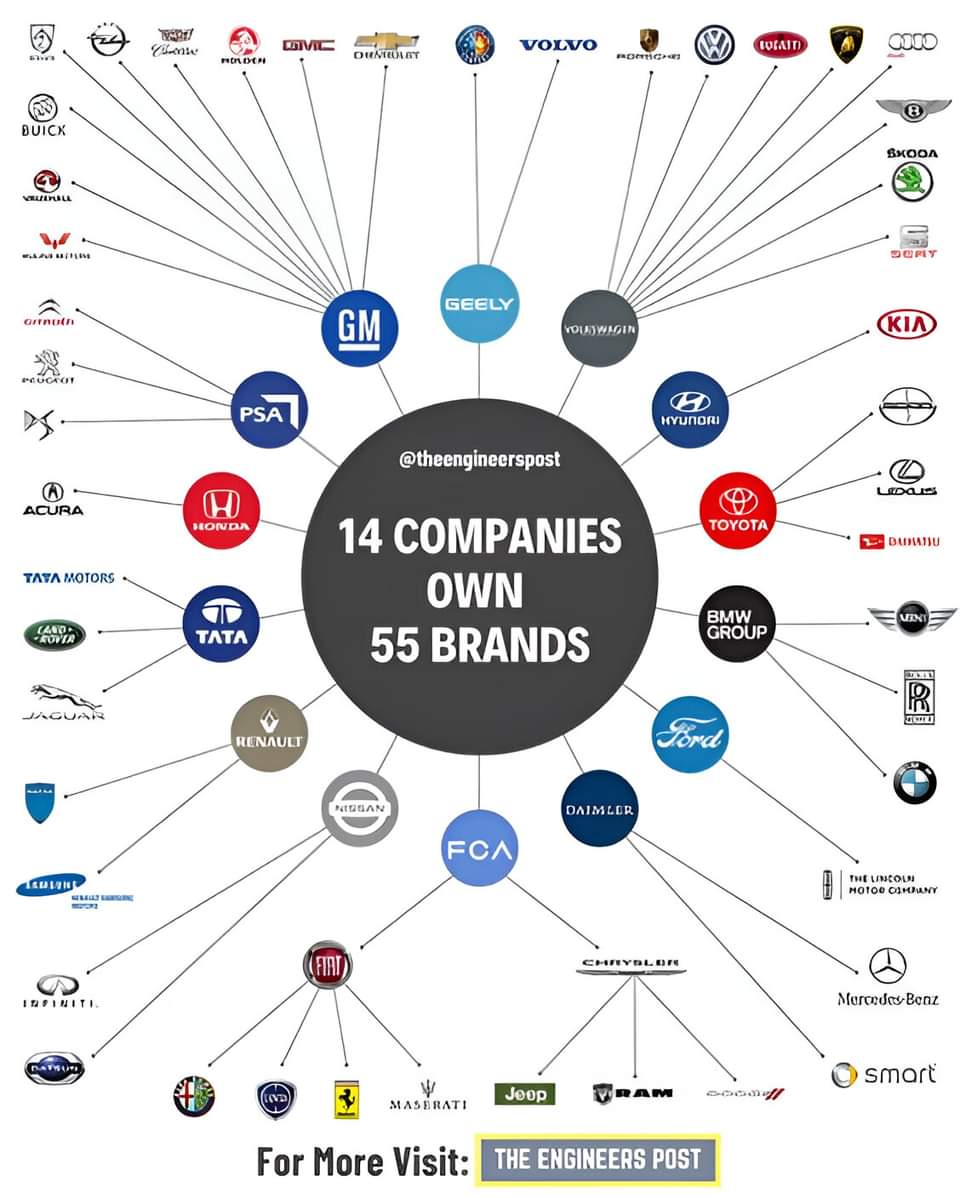 Автомашины 55 брэндийг 14 компани эзэмшдэг. Бидэнд шинэ тутам гэж ойлгогддог "Geely", "BYD" зэрэг БНХАУ-ын компаниуд өнгөрсөн зуунд байгуулагдаж анхныхаа бүтээгдэхүүнийг гаргаж байсан ч одоо л бидэнд танигдаж байна. Арван жилийн дараа гэхэд эдгээр 14 компанийн 55 брэндийг эзэмшдэг байр солигдсон байхыг үгүйсгэхгүй.
