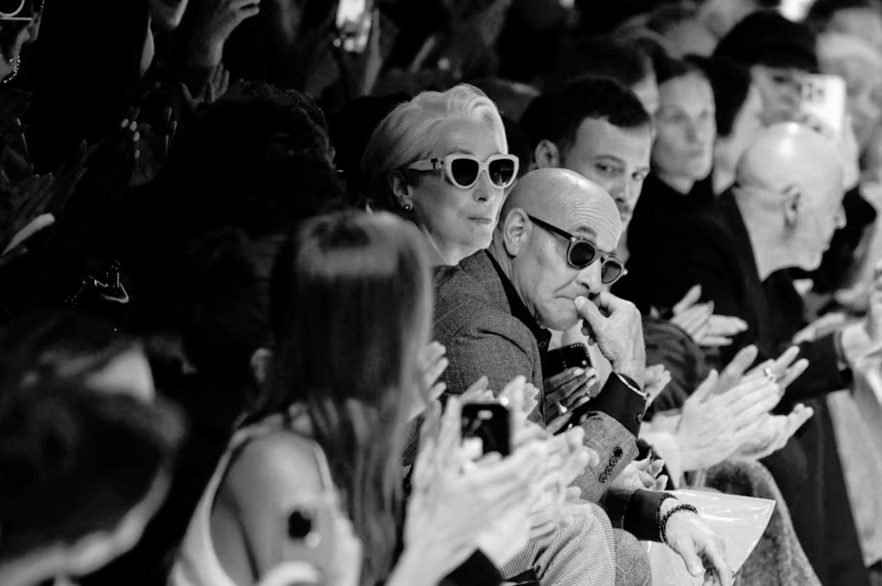 Дизайнерууд уламжлалт ёсоороо тайзан дээр бөхийхдөө арай удаан зогсож, харин Стрип ба Туччи нарыг тайзны ард аваачихад бодит загварын шоуны үзэгчид тэр мөчийг түүхэн агшин болгон гэрэл зурагт үлдээхээр тайзан дээр давхиж гарсан байна.