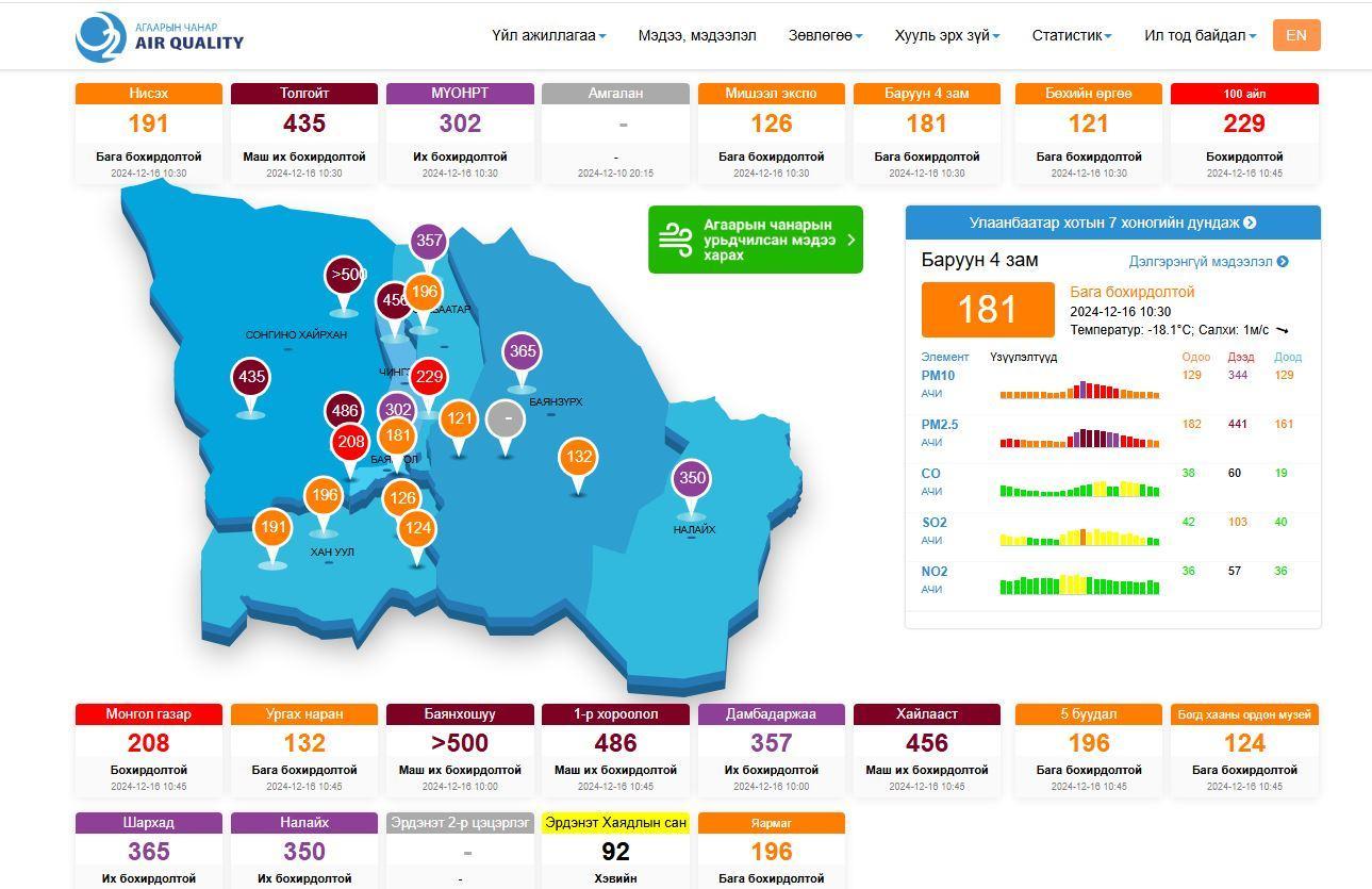 Агаарын чанарын индексийг заадаг agaar.mn сайтад өглөөний 11.00 цагийн байдлаар Толгойт, Хайлааст болон 1-р хороолол орчимд агаар маш их бохирдолтой гэж заажээ.