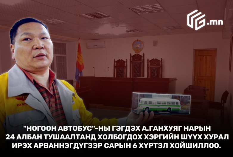 Ногоон автобусны гэх тодотголтой А.Ганхуяг нарын 24 хүнд холбогдох хэргийн шүүх хурал өнөөдөр /2024.10.21/ 10.00 цагт эхлэх товтой. Одоогоор шүүх хурал эхлээгүй гэж шүүхээс мэдээллээ.