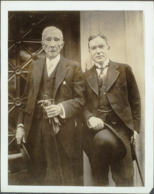 Рокфеллерт сард тавин мянган тусламж хүссэн захидал ирдэг. Тэр боломжийн хирээр хариу өгч заримд нь чек илгээдэг. Рокфеллер 1897 оноос “Standard Oil”-ын удирдах үүргийг чадварлаг хамтрагчиддаа даатган өөрөө өргөл барьц тэтгэмжийн асуудал эрхлэх болов. Түүний ачаар 1892 онд Чикагогийн их сургууль, 1901 онд Рокфеллерын анагаах ухааны дээд сургууль (хожим Рокфелерын их сургууль болсон), жилийн дараа бүх нийтийн боловсролын зөвлөл, 1913 онд Рокфеллерын санг тус тус байгуулжээ.