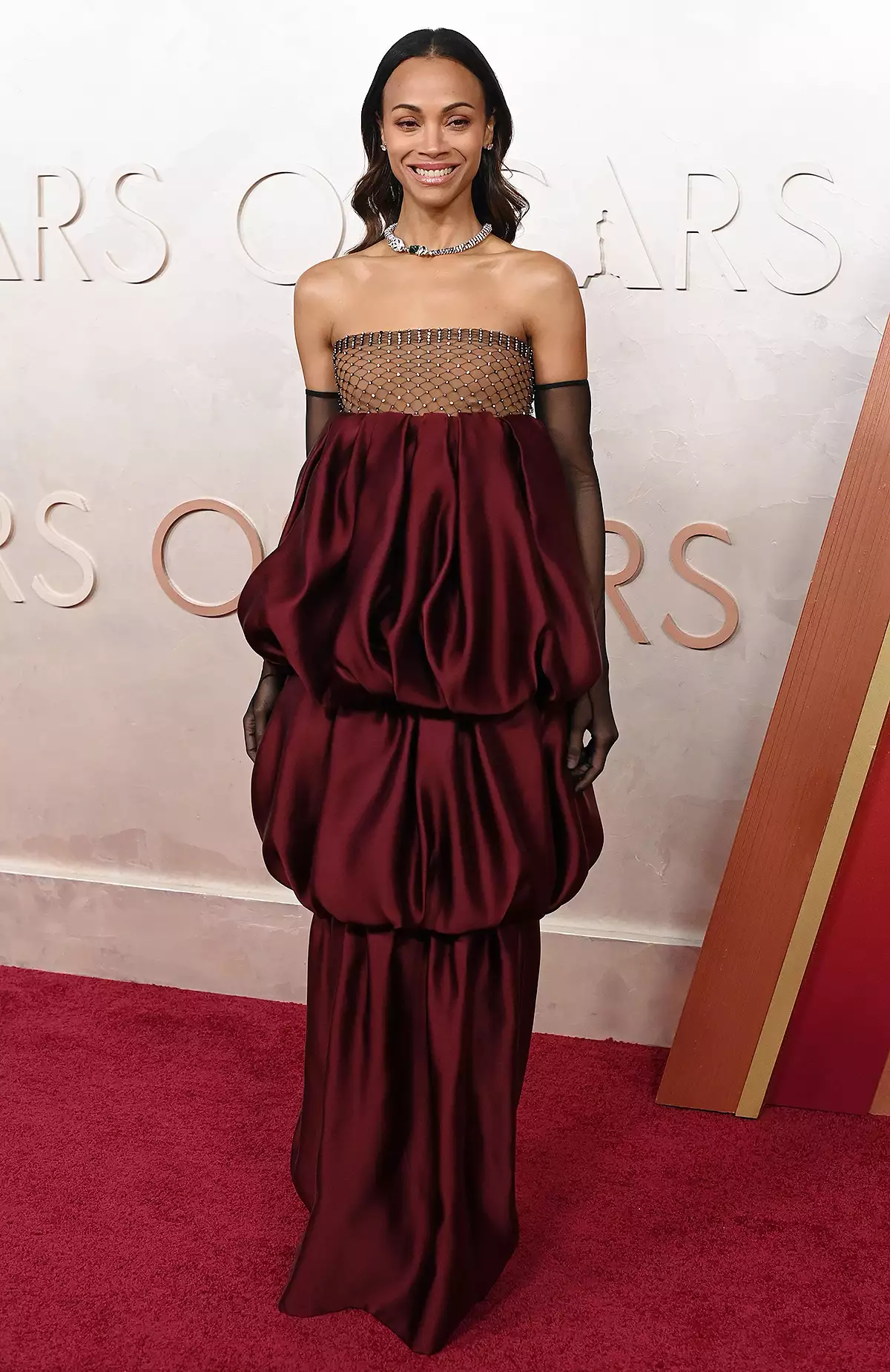 "Saint Laurent by Anthony Vaccarello"-ний чулуу шигтгэсэн детальтай даашинз, дарсны улаан өнгийн олон давхар хормой, тунгалаг дуурийн бээлийтэй Зои Салдана улам эрхэмсэг харагдав.
