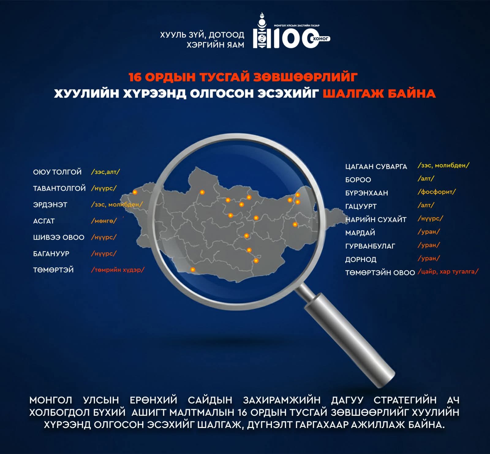 Байгаль орчин, уур амьсгалын өөрчлөлтийн яамнаас стратегийн ач холбогдол бүхий ашигт малтмалын 16 орд газарт тусгай зөвшөөрөл эзэмшиж байгаа хуулийн этгээдүүд нь тухайн төсөлдөө байгаль орчны нөлөөлөх байдлын үнэлгээ хийлгэсэн эсэх, байгаль орчны менежментийн төлөвлөгөөг байгуулсан эсэх, нөхөн сэргээлтийн барьцаа хөрөнгийг байршуулсан эсэхийг шалгах;