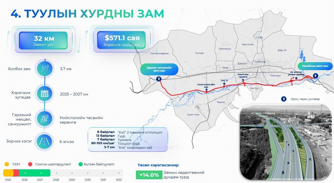 Яармагийг ТЭЦ-4 рүү холбосон Наадамчдын зам, Толгойт, Содон хорооллыг холбосон авто зам, Зайсангийн гүүр, Таван шарын нүхэн гарц гээд 2024-2025 онд нийслэлээс барьсан төслүүдийг эс тооцвол Улаанбаатар хотод “Уулын зам”-ыг барьснаас хойш шинээр томоохон авто зам барьж байгаагүй. 2024 оноос Туулын хурдны зам, Шинэ тойрог зам гэсэн төслүүд яригдаж эхэлсэн. Төслүүд боловсорч гүйцэж, гүйцэтгэгч, санхүүжилт нь шийдэгдэж, ажил нь эхлэхтэй зэрэгцэн нэлээдгүй эсэргүүцэлтэй нүүр тулж байна. Хотын дарга Н.Нямбаатарын хувьд Туулын хурдны зам түгжрэлийг дунджаар 30 хувь бууруулах маш их ач холбогдолтой төсөл. Тойрог замтайгаа нийлбэл Улаанбаатар хотын түгжрэл 50 хувиар буурна. Эдгээр төслийг эсэргүүцэж байгаа хүмүүс бүгд л ашиг сонирхолтой, түгжрэлийг үнэхээр бууруулчих вий гэдгээс айж байгаа” хэмээн хэлж байв.