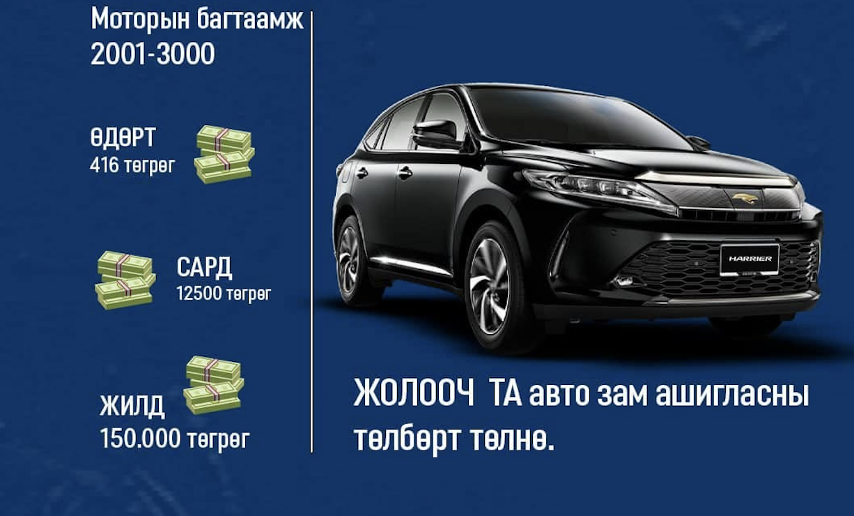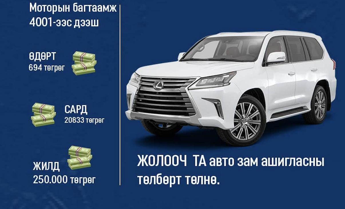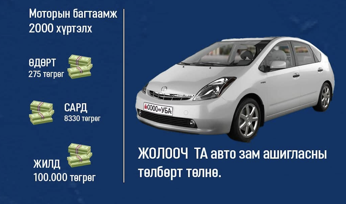 Тодруулбал, автомашины хөдөлгүүрийн багтаамжаасаа хамаарч 36 мянгаас 300 мянган төгрөгийг жил бүр бүр тээврийн хэрэгслийн албан татварт төлдөг байсан. Тэгвэл энэ оны нэгдүгээр сарын 1-ээс тээврийн хэрэгслийн албан татвар гурав дахин нэмэгдсэнээр 1500см3 хөдөлгүүрийн багтаамжтай жижиг оврын автомашины албан татвар 36 мянгаас 108 мянган төгрөг болсон. Харин зам ашигласны төлбөр 20 мянган төгрөг төлж байсныг тав дахин нэмэгдүүлж 100 мянган төгрөг болгосон.