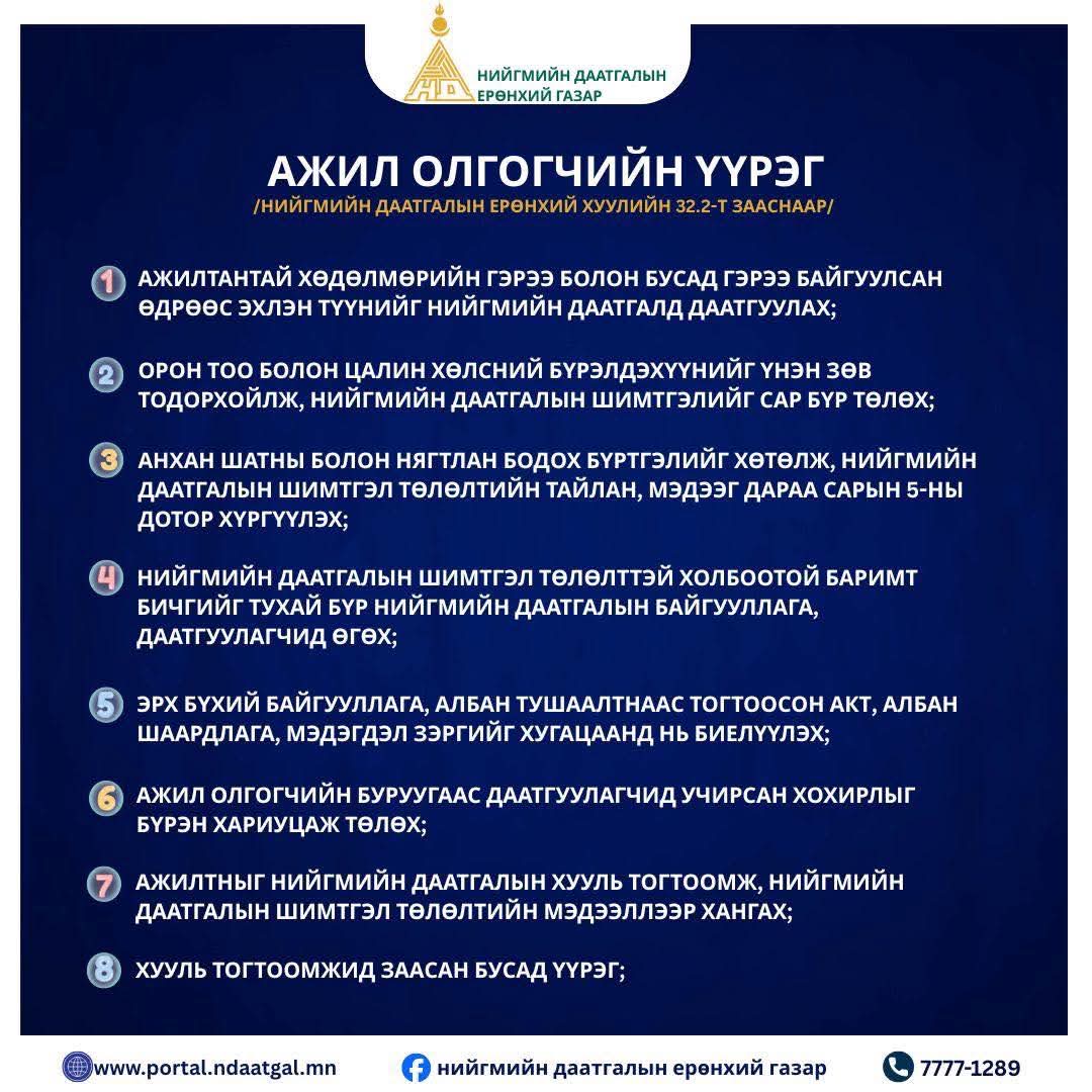 Тиймээс ажил олгогч та бүхэн Нийгмийн даатгалын ерөнхий хууль болон бусад хуульд тогтоомжид заасан үүргээ ухамсарлан нийгмийн даатгалын байгууллагад нийгмийн даатгалын шимтгэлийн тайлангаа үнэн зөв тайлагнаж ирүүлэхийг хүсье.