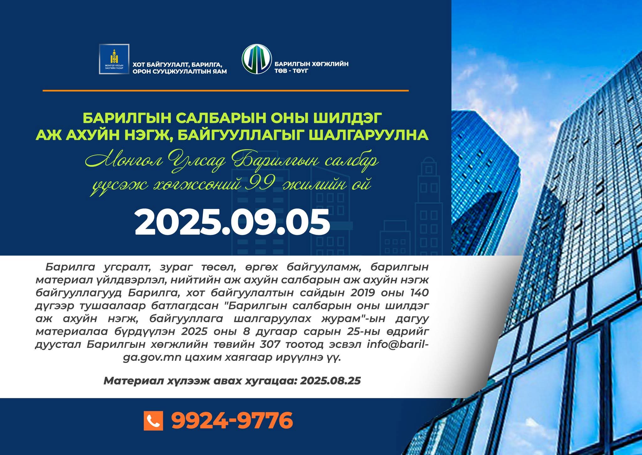Барилга угсралт, зураг төсөл, өргөх байгууламж, барилгын материал үйлдвэрлэл, нийтийн аж ахуйн салбарын аж ахуйн нэгж байгууллагууд Барилга, хот байгуулалтын сайдын 2019 оны 140 дүгээр тушаалаар батлагдсан "Барилгын салбарын оны шилдэг аж ахуйн нэгж, байгууллага шалгаруулах журам"-ын дагуу материалаа бүрдүүлэн 2025 оны 8 дугаар сарын 25-ны өдрийг дуустал Барилгын хөгжлийн төвийн 307 тоотод эсвэл info@barilga.gov.mn цахим хаягаар ирүүлнэ үү.