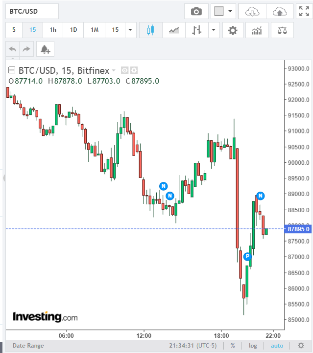 Биткойн мэдэгдлийн дараа 6%-иар унаж, $84,864.3-д хүрсэн байна.