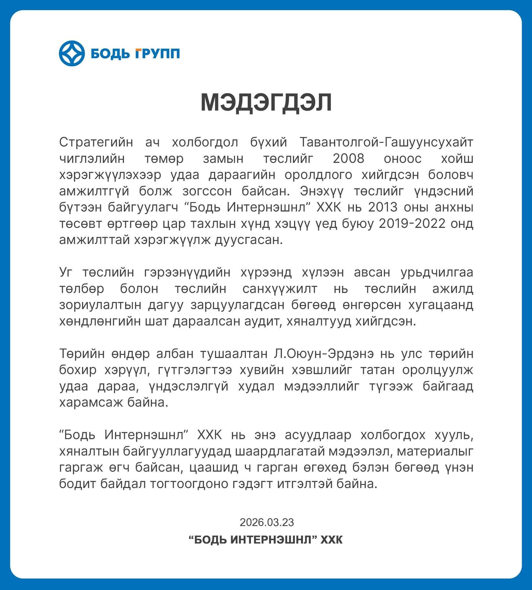 Өнөөдөр “Бодь Групп” дараах мэдэгдлийг хийлээ. Мэдэгдэл ч гэж дээ мэдэгдэл л юм даа. Өмнөх Ерөнхий сайд асан нь Хууль зүй, Дотоод хэргийн сайдтай холбоотой ихээхэн хэмжээний мөнгөн дүн ярьж, өнөөдрийн ханшаар 3.8 тэрбум төгрөг, бүхэл дүн нь 110 сая ам.доллар буюу 391.0 тэрбум төгрөгийн авлигын талаар илчилсэн баримтад “Бодь Групп”-ийн хийж байгаа мэдэгдэл гэхэд үнэхээр ядмагхан байлаа.