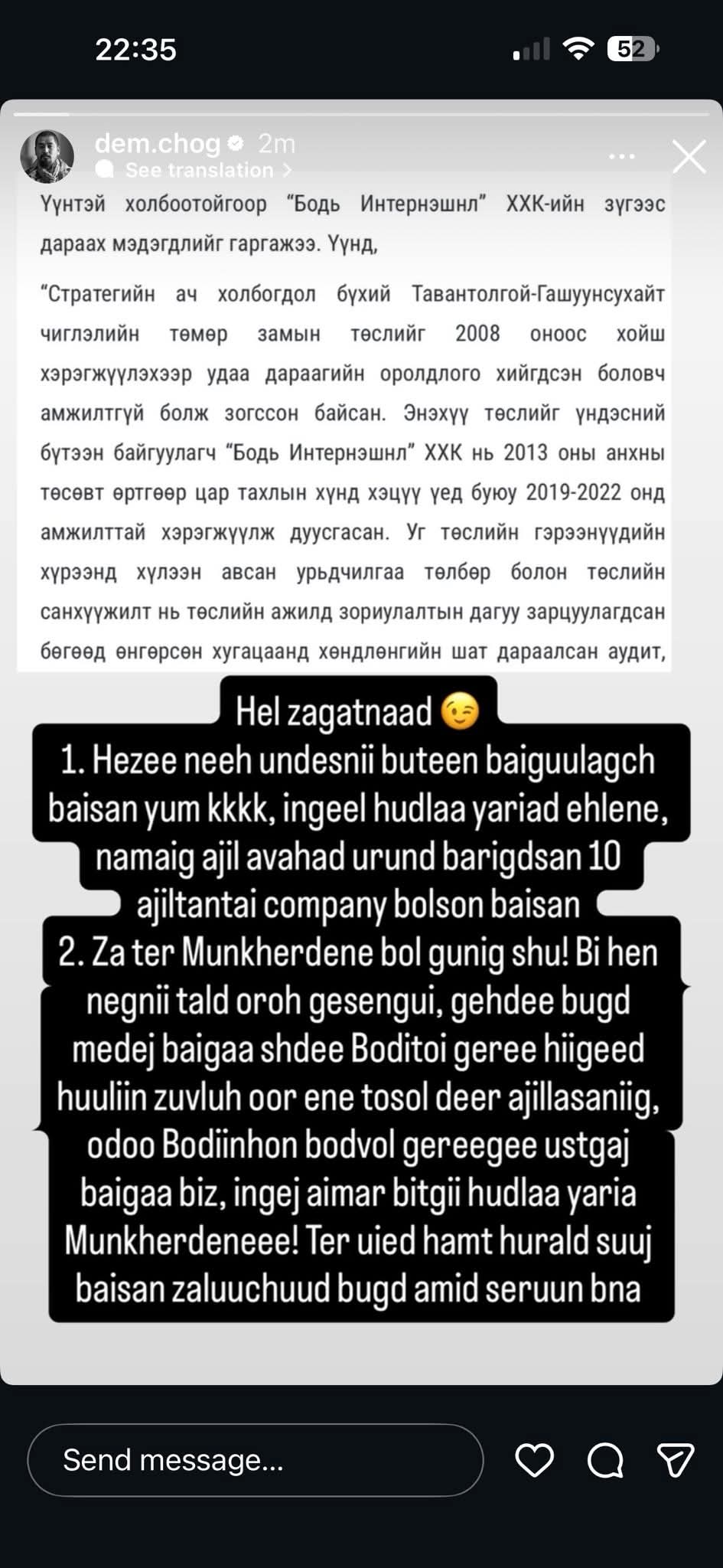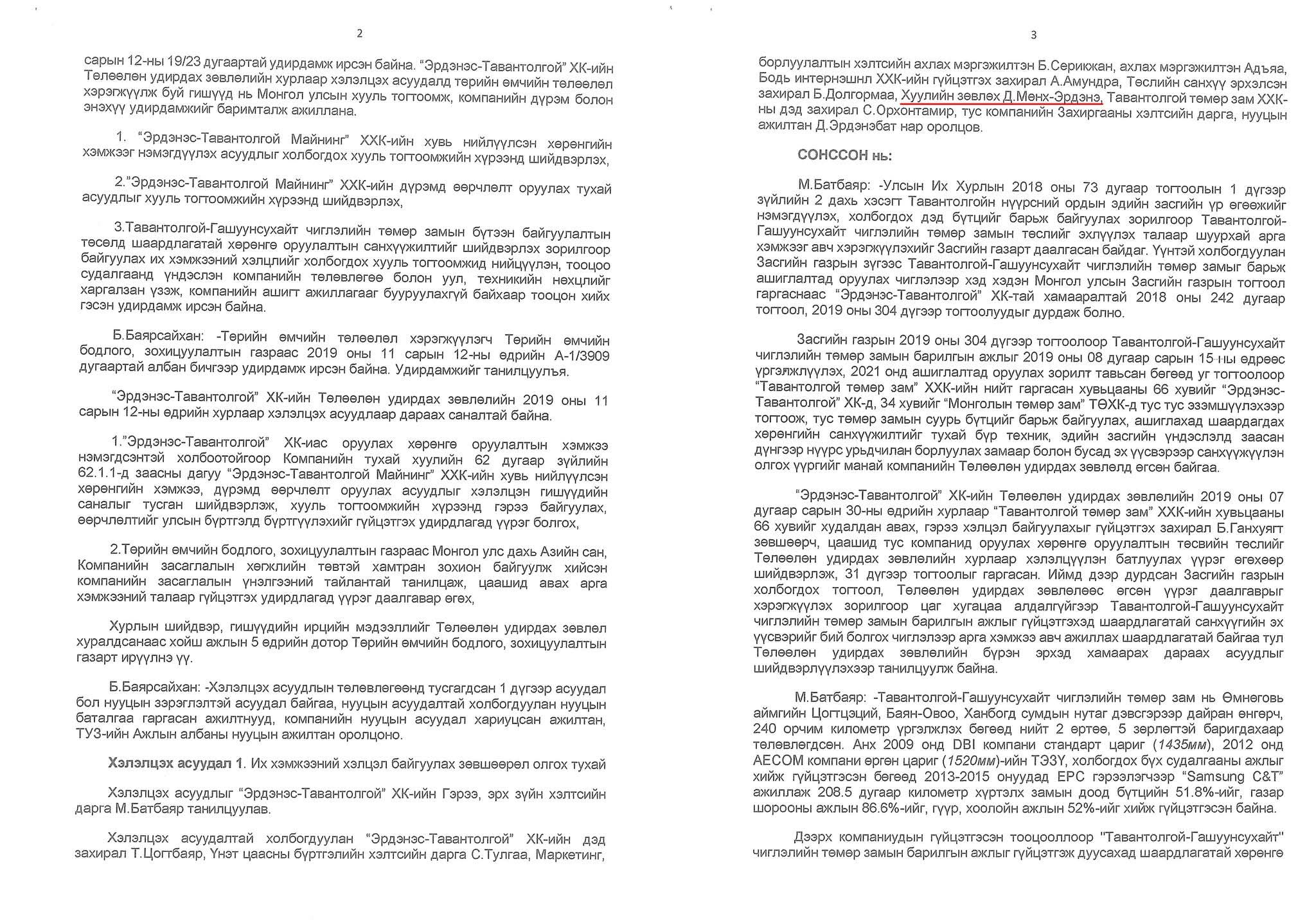 2. За тэр Мөнх-Эрдэнэ бол гуниг шүү! Би хэн нэгний талд орох гэсэнгүй. Гэхдээ бүгд мэдэж байгаа ш дээ. “Боди”-той гэрээ хийгээд хуулийн зөвлөхөөр энэ төсөл дээр ажилласныг, одоо Бодийнхон бодвол гэрээгээ устгаж байгаа биз. Ингэж аймаар битгий худлаа яриа Мөнх-Эрдэнээ! Тэр үед хамт хуралд сууж байсан залуучууд бүгд амьд сэрүүн байна.
