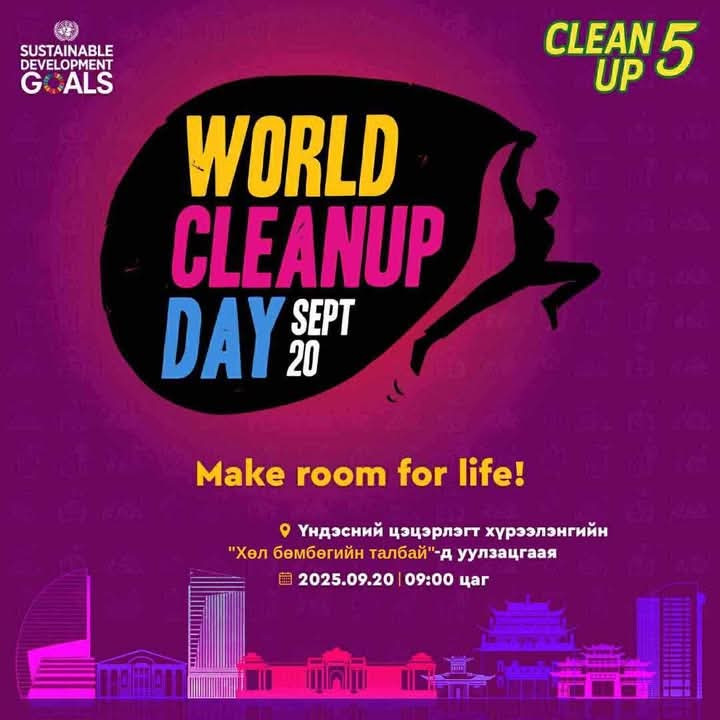 2025 оны 9 дүгээр сарын 20-ны өдөр 09:00 цагаас Үндэсний цэцэрлэгт хүрээлэнд зохион байгуулагдах “Clean Up – 2025” үндэсний сайн дурын цэвэрлэгээний үйл ажиллагаанд та бүхнийг урьж байна.