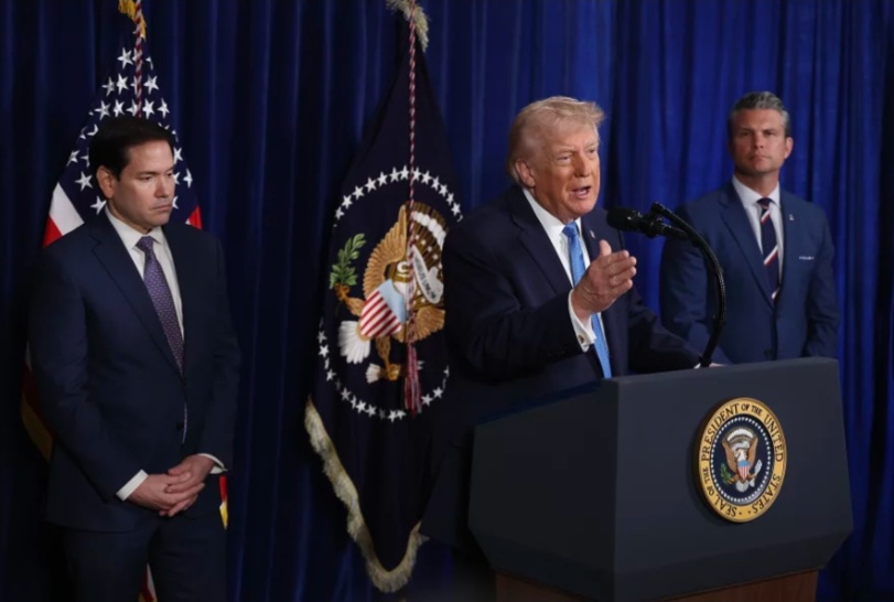 2026 оны 1 дүгээр сарын 3-ны Бямба гарагт Флорида мужийн Палм-Бич хот дахь Мар-а-Лаго клубт болсон хэвлэлийн бага хурлын үеэр Ерөнхийлөгч Дональд Трамп хэвлэл мэдээллийнхэнд хандан үг хэлж байна. Түүний ард Төрийн нарийн бичгийн дарга Марко Рубио, Батлан хамгаалахын сайд Пит Хегсет нар бараа болж буй нь.
