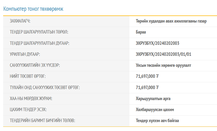 Энэхүү тендерийг 12 дугаар сарын 06-ны өдөр зарласан бөгөөд материалыг 12 дугаар сарын 16-ны 09.00 цаг хүртэл хүлээн авах юм байна. Харин тухайн тендерийн нийт өртөг урсгал төсвөөс гарна хэмээн тусгасан байна.