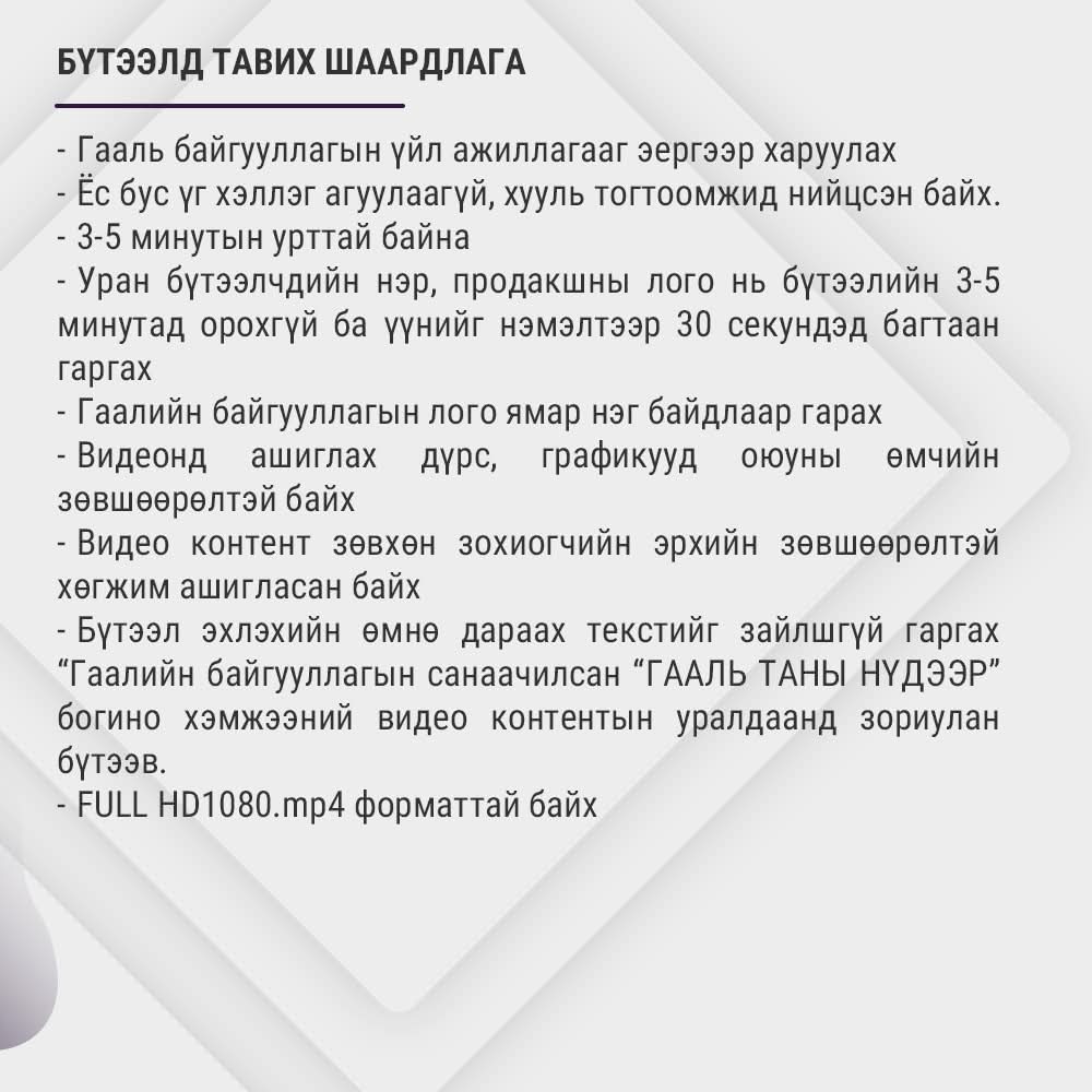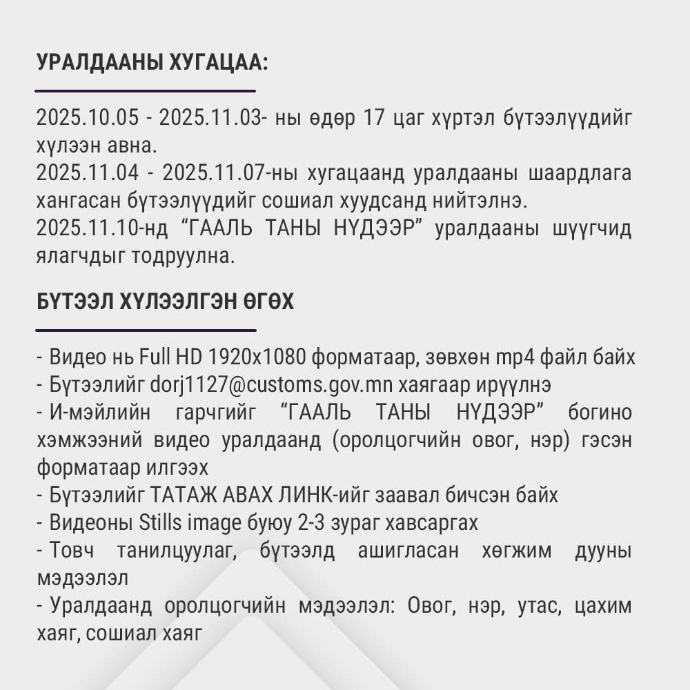 🔹Хугацаа: “Гааль таны нүдээр” видео контент бүтээх уралдаанд өрсөлдөх бүтээлийг 2025 оны 10 дугаар сарын 05-наас 11 дүгээр сарын 03-ны өдрийн 17:00 цаг хүртэл dorj1127@customs.gov.mn хаягаар хүлээн авна. Эхний шатанд шалгарсан бүтээлүүдийг 11 дүгээр сарын 04-07-ны өдрүүдэд цахим сүлжээнд нийтэлнэ.