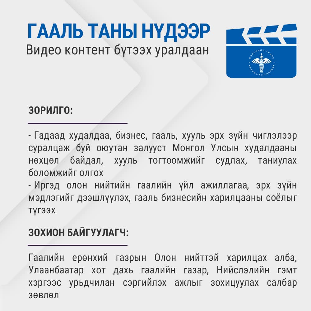 Монгол Улсын худалдааны нөхцөл байдал, хууль тогтоомжийг судлах, таниулах боломжийг олгох, гааль бизнесийн харилцааны соёлыг түгээх зорилгоор зохион байгуулж буй “Гааль таны нүдээр” видео контент бүтээх уралдаанд гадаад худалдаа, эдийн засаг, банк, санхүү, эрх зүй гэх мэт чиглэлээр суралцдаг оюутан залуусыг өргөнөөр оролцохыг урьж байна.