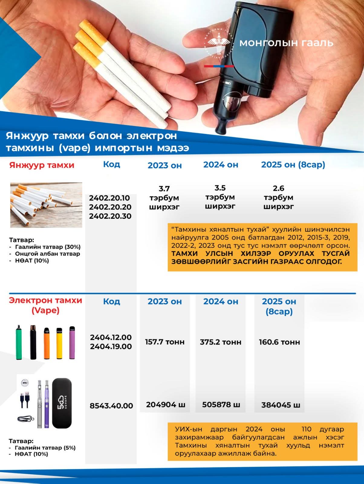 Нэг удаагийн хэрэглээний электрон тамхи, электрон тамхи цэнэглэгч гель болон шингэн, электрон тамхины картриж буюу цэнэглэгч хошуу нь "Тамхи, дахин боловсруулсан тамхи, никотин агуулсан эсвэл никотин орлуулагч агуулсан асаахгүйгээр сорж татах зориулалттай бүтээгдэхүүн"-ий бүлэг буюу 2404.12.00, 2404.19.00 кодуудад ангилагддаг бөгөөд 2023 онд 157.7 тонн, 2024 онд 375.2 тонн, 2025 оны 8 эхний сарын байдлаар 160.6 тонныг импортолсон байна. 2024 онд импортолсон тухайн бүтээгдэхүүнийг өнгөрсөн оны мөн үетэй харьцуулахад 217.5 тонноор буюу 2.3 дахин өсжээ 📈📈📈📈