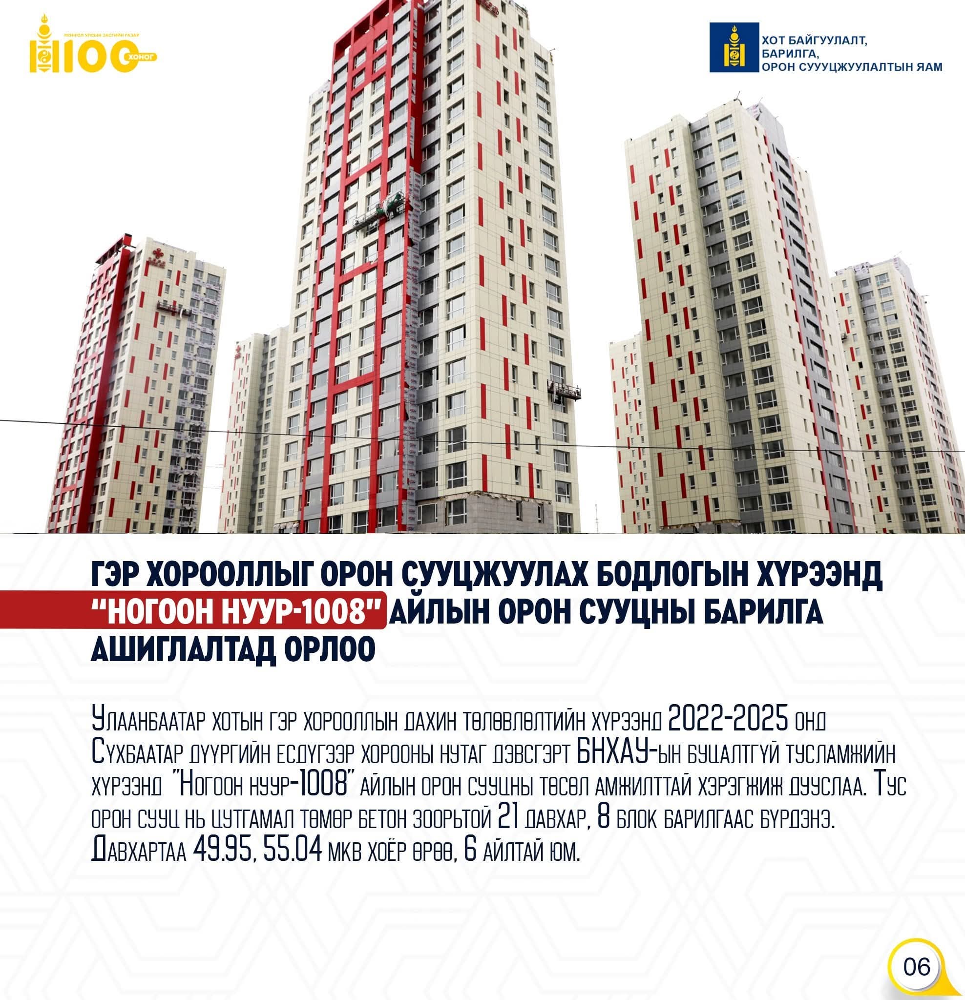 ✅Гэр хорооллыг орон сууцжуулах бодлогын хүрээнд “Ногоон нуур 1008” айлын орон сууцны барилга баригдаж дууслаа.