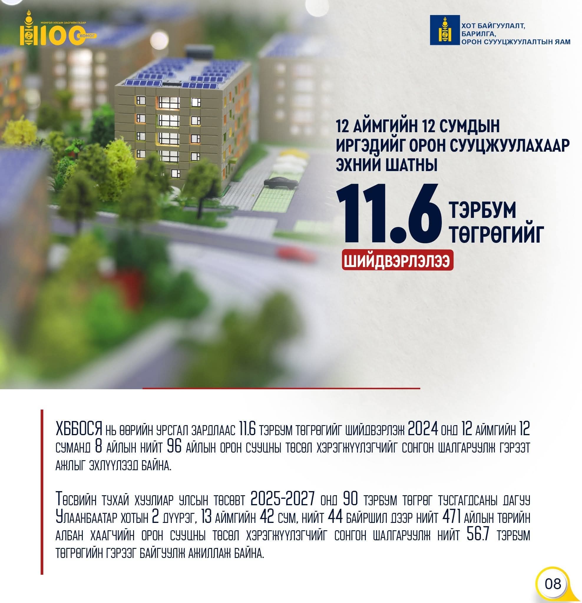 ✅12 аймгийн 12 сумдын иргэдийг орон сууцжуулахаар эхний шатны 11.6 тэрбум төгрөгийг шийдвэрлэлээ.