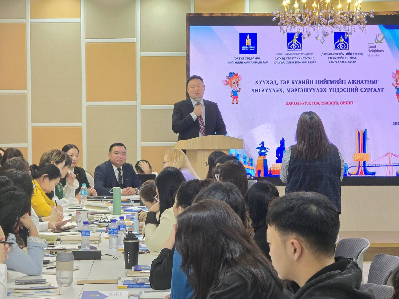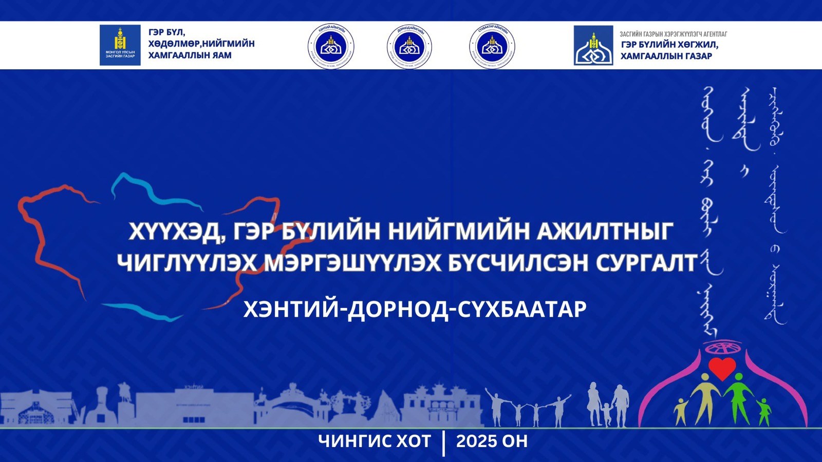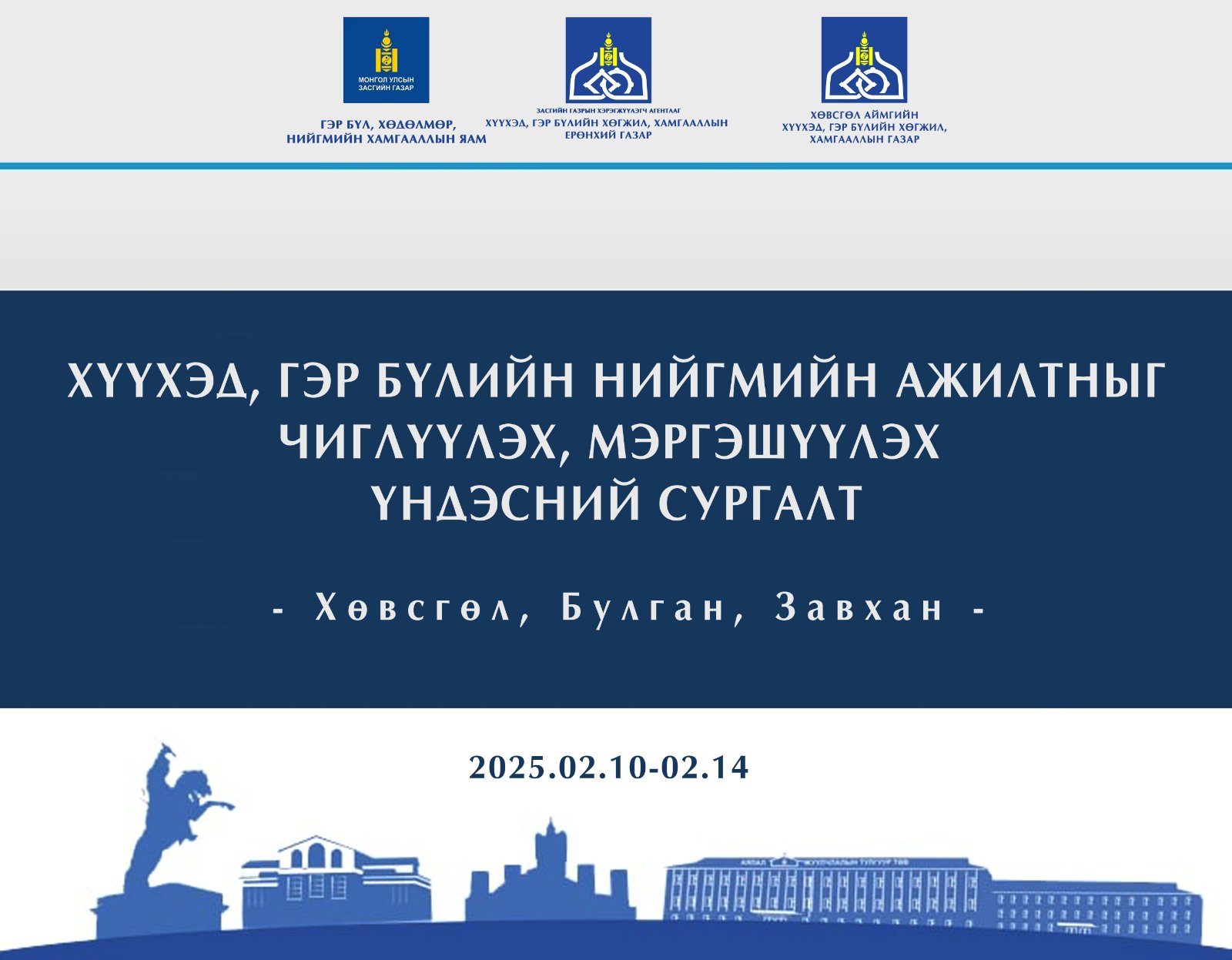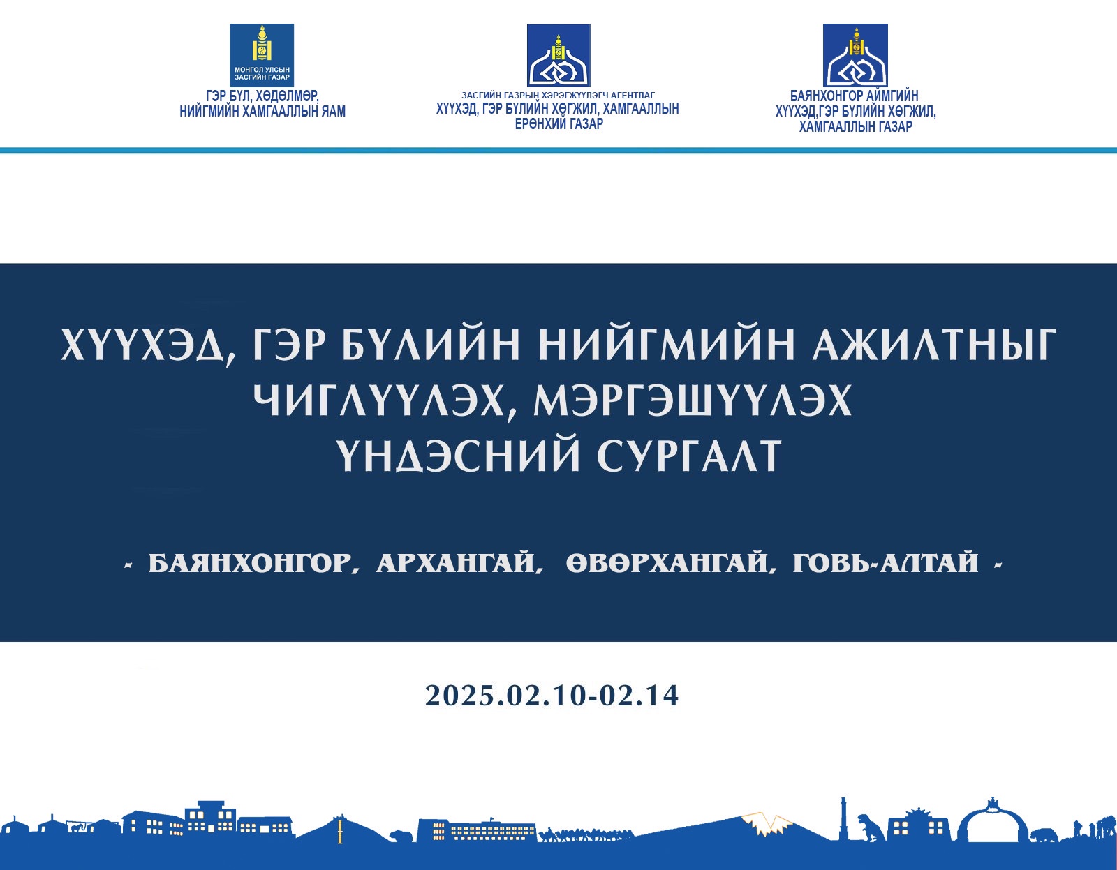 -Сум, хороонд ажиллах хүүхэд, гэр бүлийн нийгмийн ажилтныг чадавхжуулах, чиглүүлэх үндэсний хэмжээний сургалтыг орон даяар 2025.02.10-14-ний хооронд бүсчлэн зохион байгуулж байна