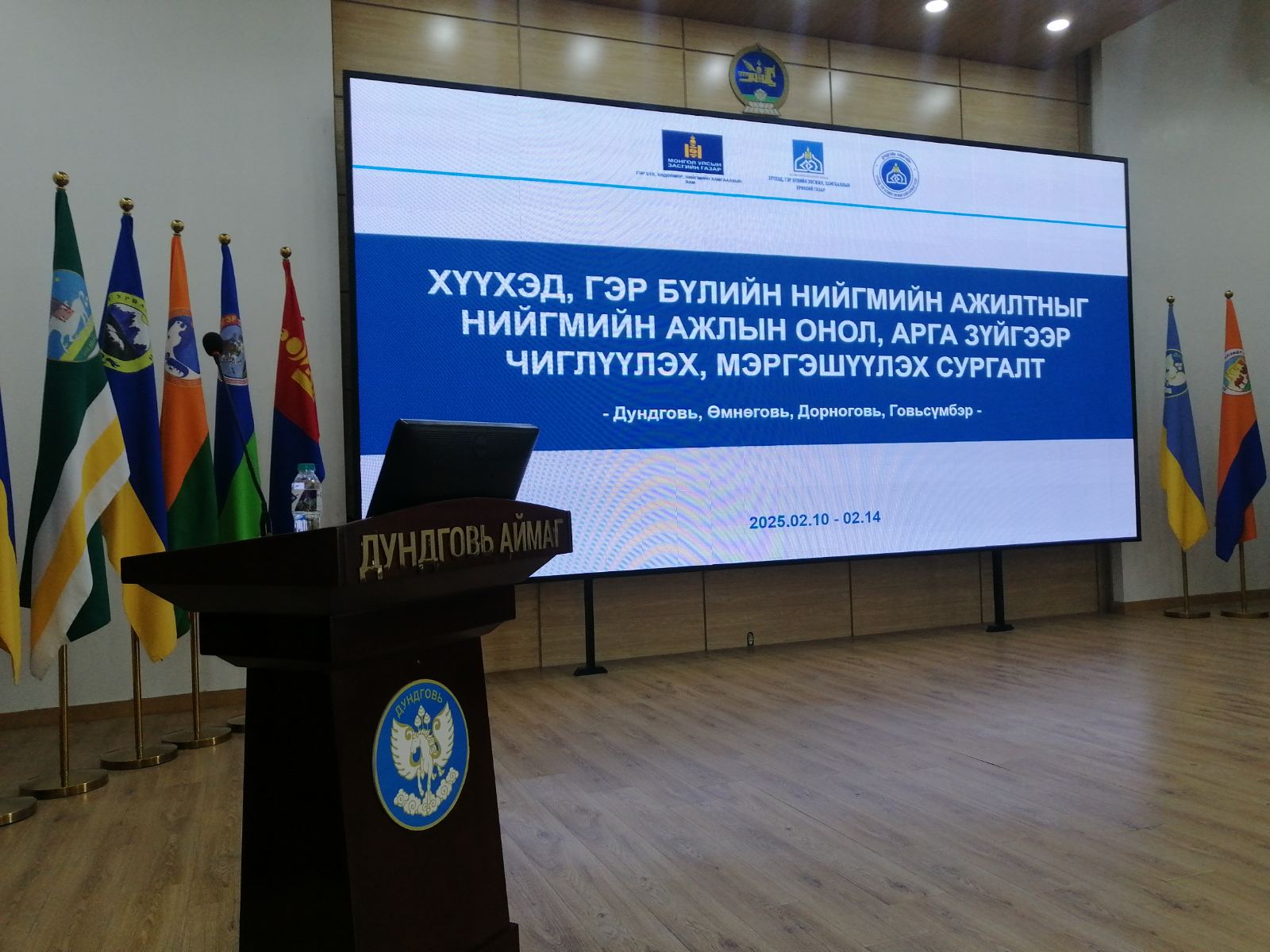 -ХГБХХЕГ-ын Мэдээллийн технологи, хяналт шинжилгээ, үнэлгээний газрын дарга Н.Оюунчимэгээр ахлуулсан ажлын хэсэг Дундговь аймагт ажиллаж байгаа бөгөөд Өмнөговь, Дундговь, Дорноговь, Говьсүмбэр аймгийн нийт 68 нийгмийн ажилтан чиглүүлэх сургалтад оролцож байна.