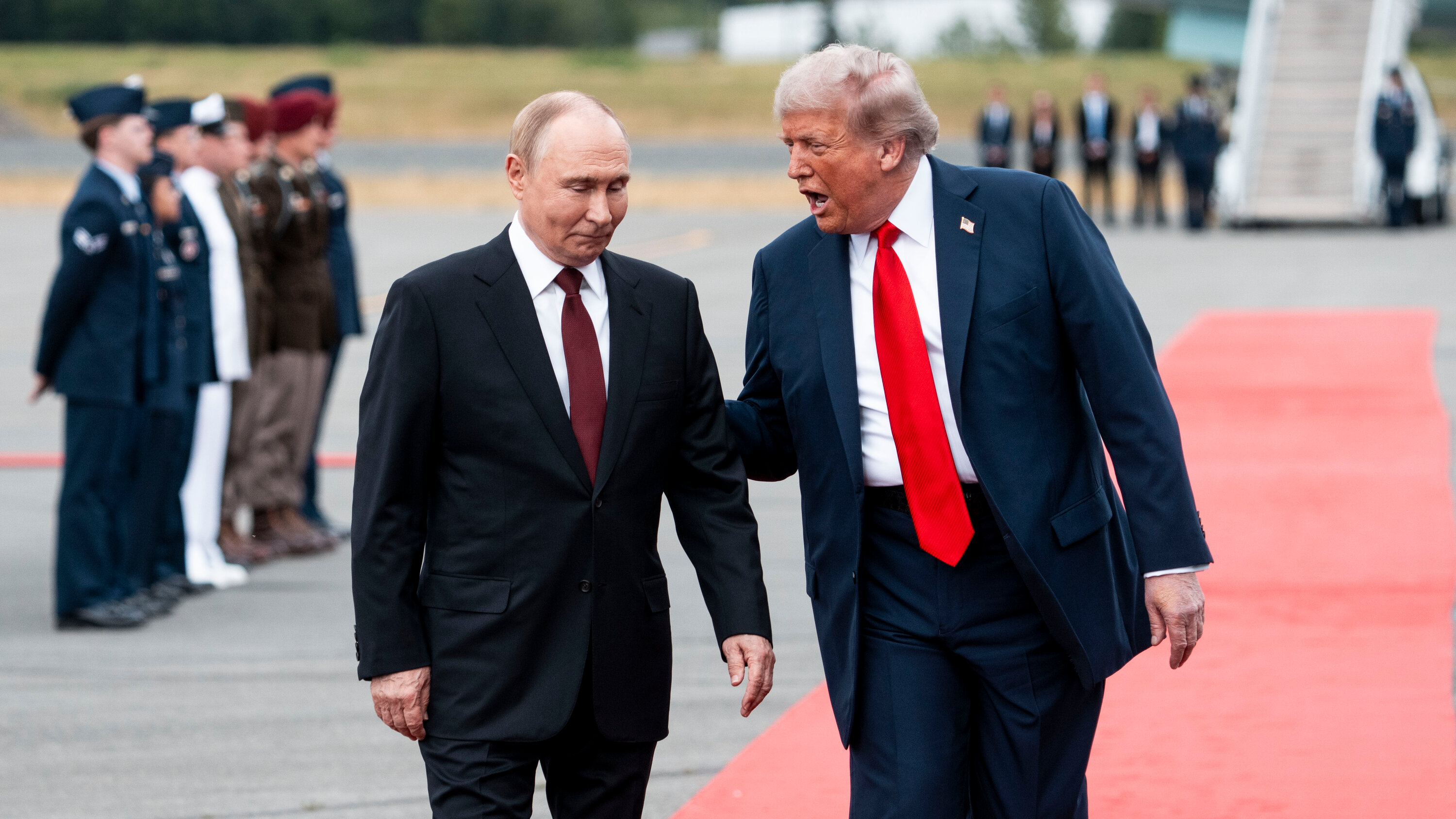 Энэхүү өндөр хүлээлттэй уулзалтын төгсгөл нь эхний сүр жавхлантай угталтын эсрэг байв. Владимир Путин Аляска дахь АНУ-ын Агаарын хүчний баазад хүрэлцэн ирэхэд улаан хивс дэвсэж, Доналд Трамп түүнийг найрсгаар угтан авч буй үед АНУ-ын цэргийн онгоцууд тэдний дээгүүр нисч өнгөрсөн байна.