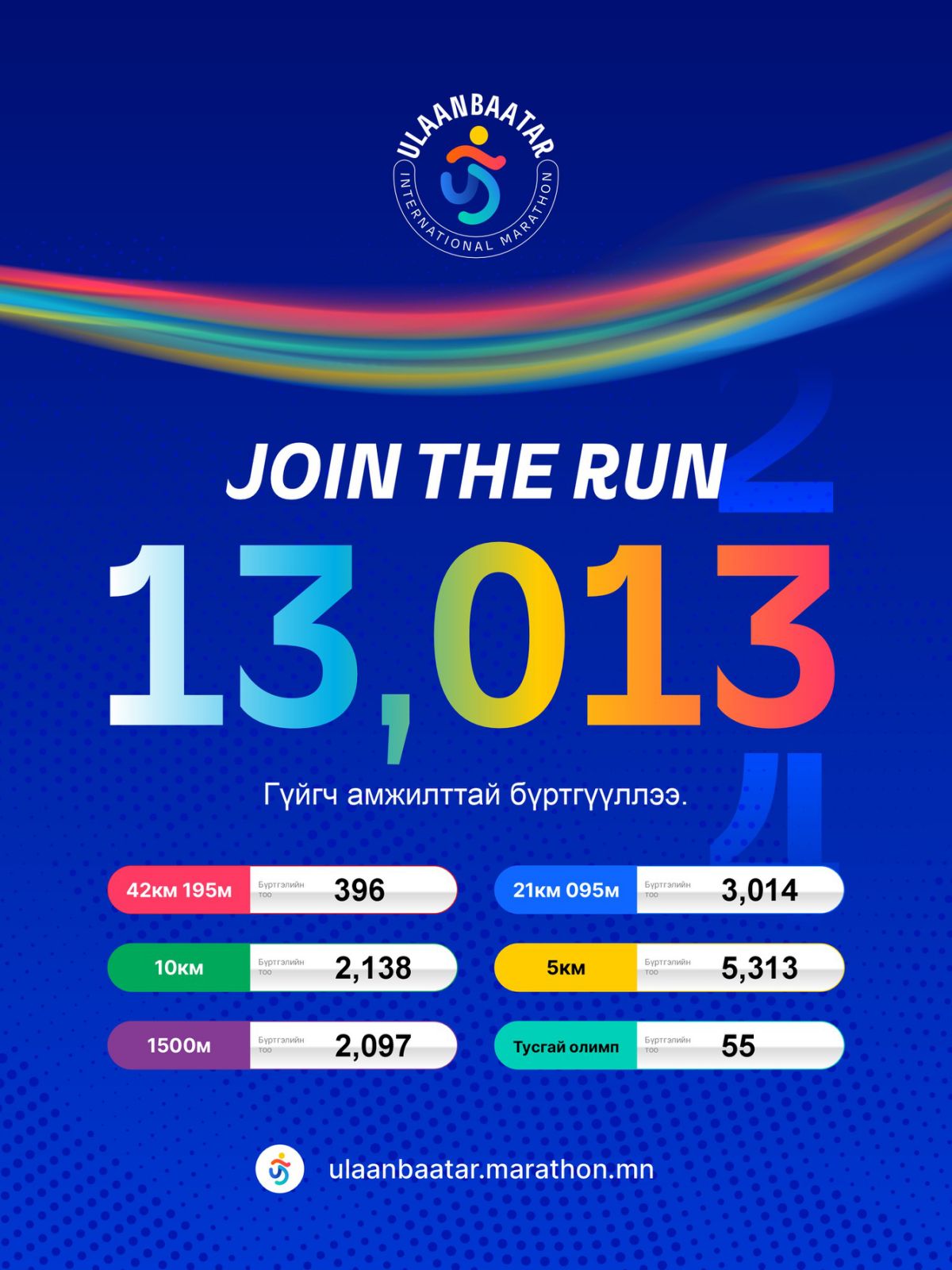 “Улаанбаатар марафон-2026” олон улсын гүйлтийг тавдугаар сарын 23-нд Д.Сүхбаатарын талбайд зохион байгуулна. Марафонд гүйх оролцогчдыг тавдугаар сарын 1-ний 17:00 цагт хүртэл бүртгэнэ. Оролцогчид Hipay аппликейшн болон ulaanbaatar.marathon.mn цахим хуудсаар дамжуулан бүртгүүлэх боломжтой. Өнөөдрийн байдлаар 13 мянга гаруй иргэн оролцохоор бүртгүүлээд байна.