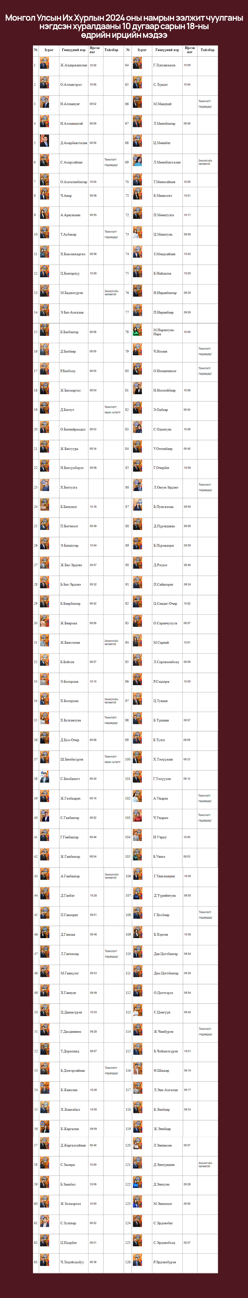 Хэдийгээр гишүүдийн ирцийн бүртгэл 15.00 цагийн байдлаар ийм байгаа ч, УИХ-ын чуулганы танхимд суугаа гишүүдийн тоо 50 хүрэхгүй байдалтай байна. Монгол Улсын 2025 оны төсвийн хуулийн төсөл болон дагалдах төслүүдийн эхний хэлэлцүүлгийг хийж эхэлсэн ийм чухал үед Засгийн газрын гишүүд УИХ-ын хуралдаандаа суухгүй байгаад УИХ-ын дарга Д.Амарбаясгалан нарын гишүүд бухимдаж, 10 минутын хугацааг ч өгсөн. Гэвч сайд нар 100 хувийн ирцтэй чуулганы хуралдаанд суусангүй.