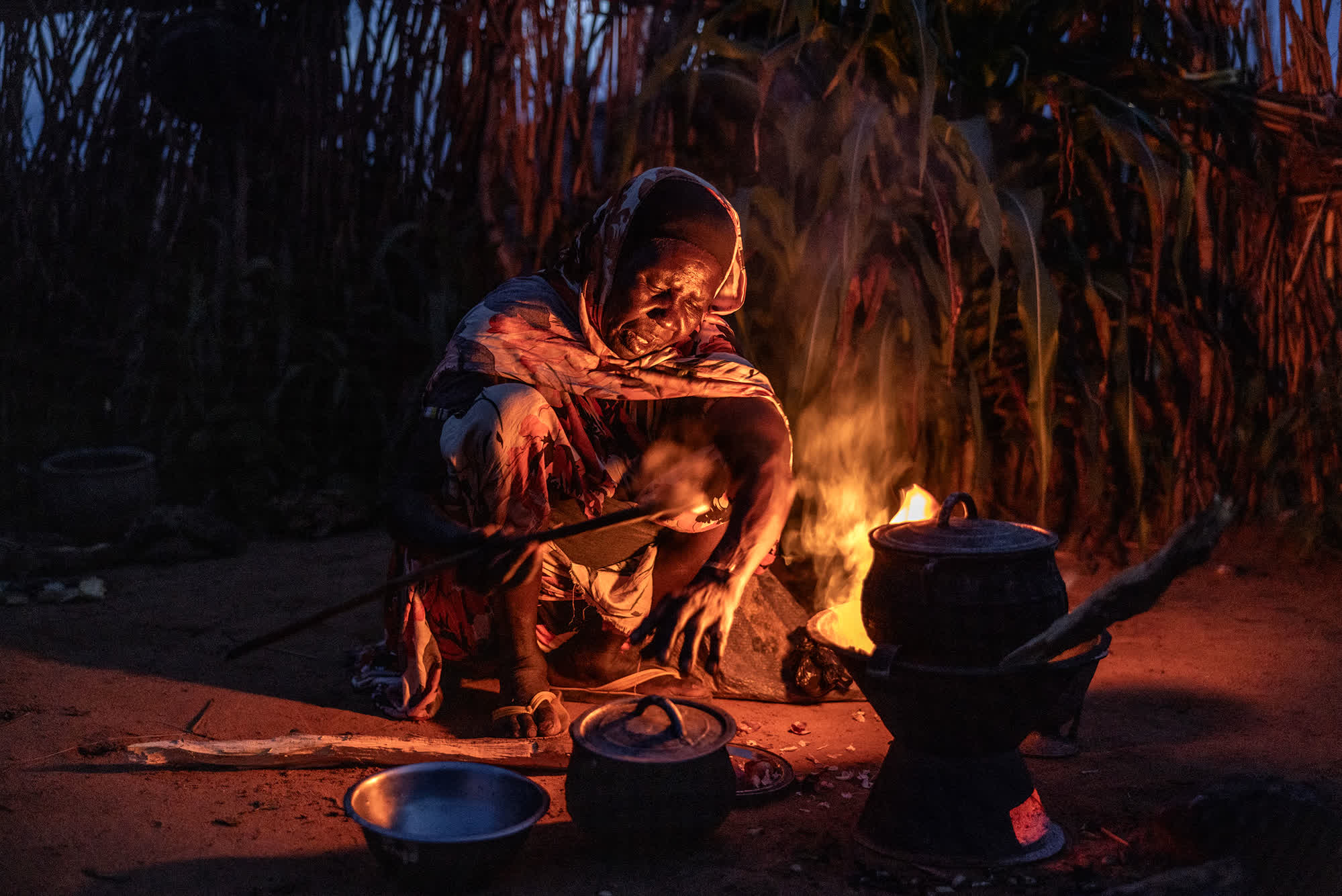 Дүрвэгч Адре дахь түр хуаранд оройн хоол бэлдэж байна