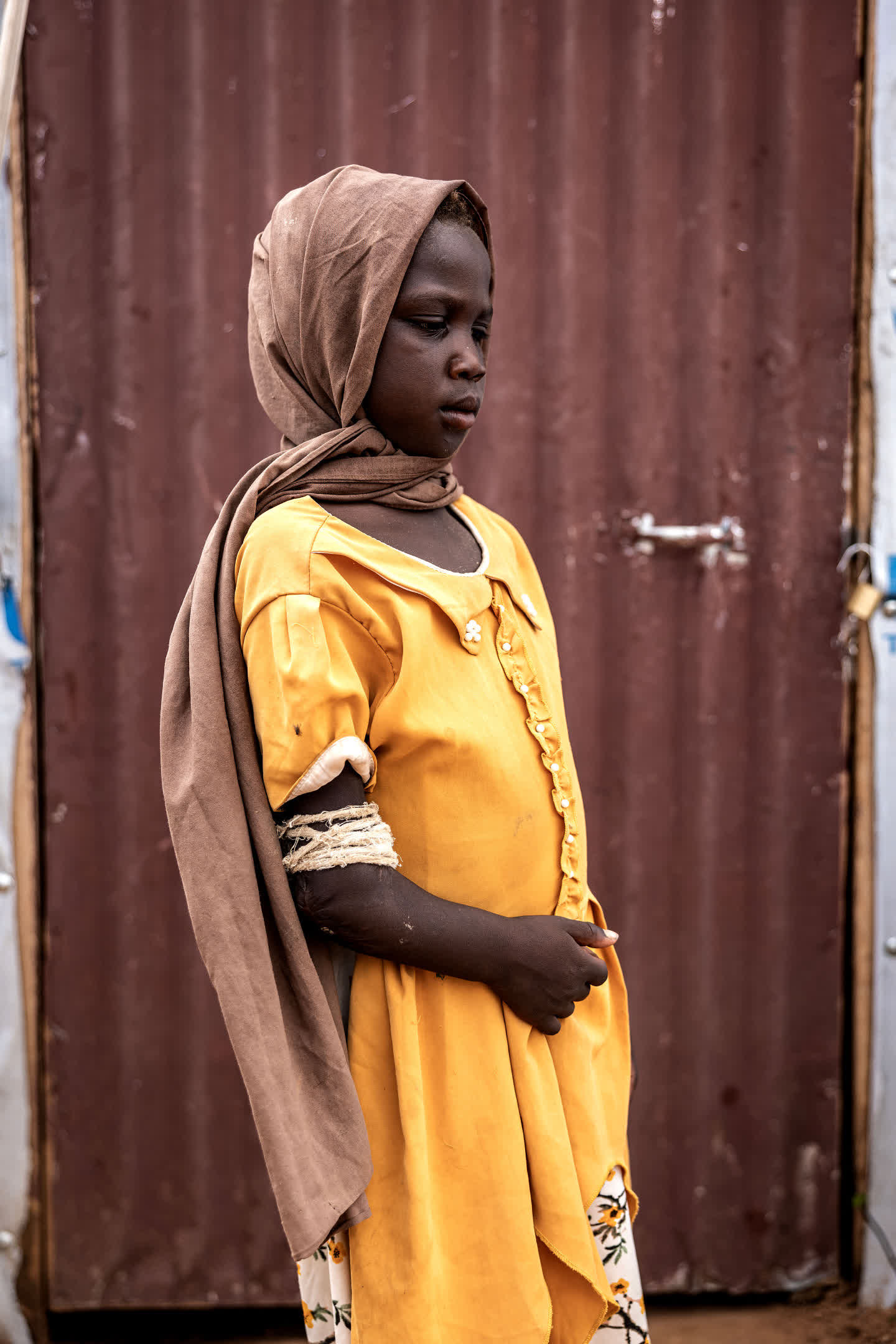8 настай Наима Мутеер Мухажар охин Фарчана дахь дүрвэгсдийн хуаранд зургаа даруулж байна. Шуурхай туслах хүчний зэвсэгт этгээдүүд түүнийг буудаж шархдуулжээ.