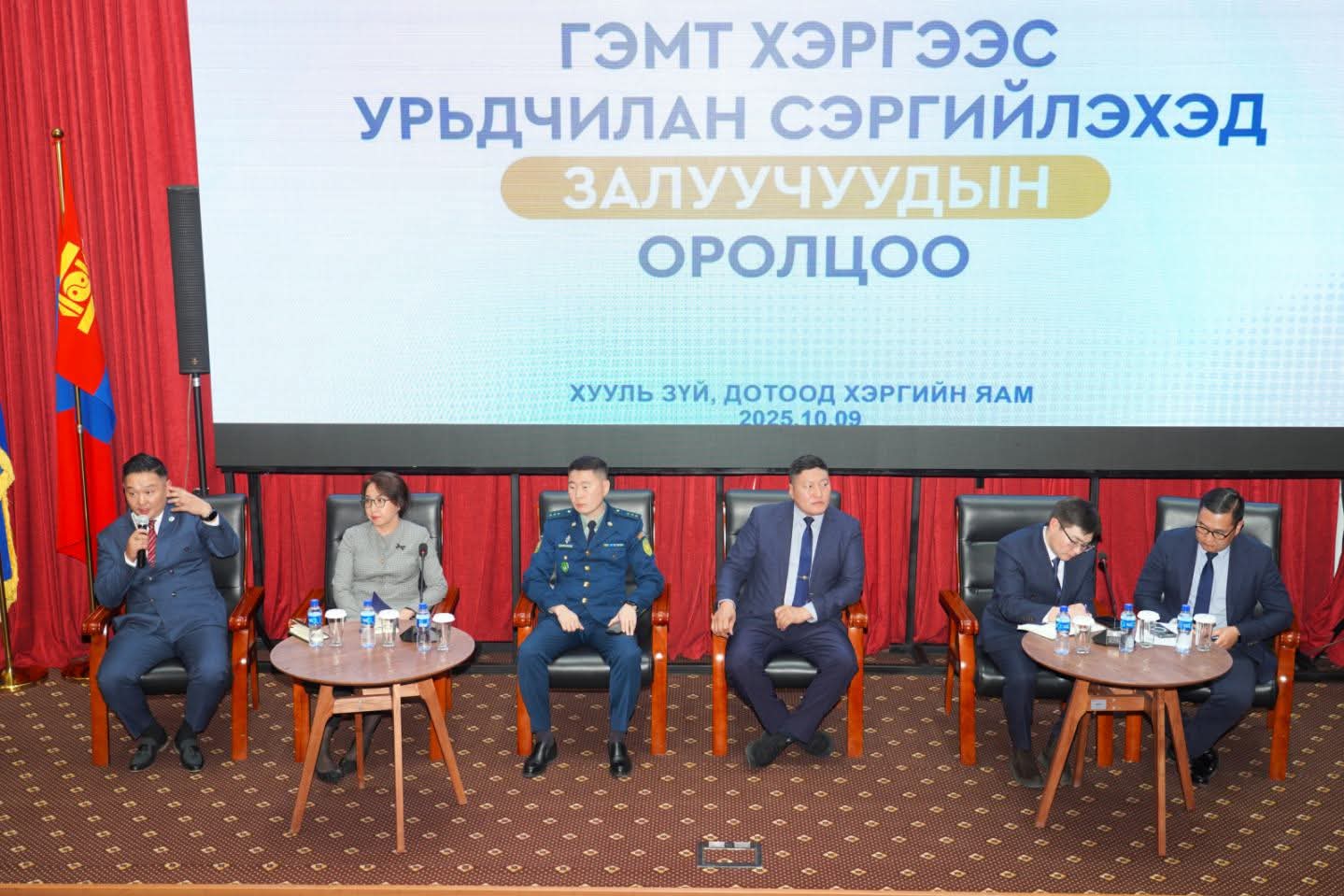 Хууль зүй, дотоод хэргийн салбарын 35 хүртэлх насны төлөөлөл 120 гаруй залуу албан хаагчийг хамруулсан “Гэмт хэргээс урьдчилан сэргийлэхэд залуучуудын оролцоо” сэдэвт салбар хэлэлцүүлэг өнөөдөр Хууль зүй, дотоод хэргийн яаманд боллоо.
