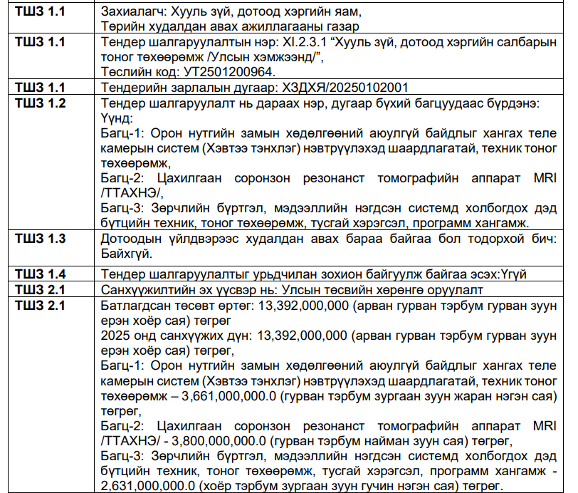 Багц-2: Цахилгаан соронзон резонанст томографийн аппарат MRI /ТТАХНЭ/ - 3,800,000,000.0 (гурван тэрбум найман зуун сая) төгрөг,