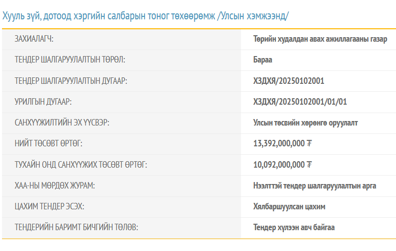 Хууль зүй, дотоод хэргийн яамнаас салбартаа улсын хэмжээнд шаардлагатай авто замын хяналтын камер болон бусад шаардагдах программ хангамж, тоног төхөөрөмжийг 13 тэрбум 392 сая төгрөгөөр худалдан авахаар тендер зарлалаа. Тендерт орох хүсэлтэй компаниудын материалыг 2025 оны 02 -р сарын 26 -ны өдрийн 11.00 цаг хүртэл хүлээн авч, тухайн өдрийн 14.00 цагт шалгаруулна гэжээ. Улсын төсвийн хөрөнгө оруулалтаар худалдан авалтыг хийнэ гэжээ.