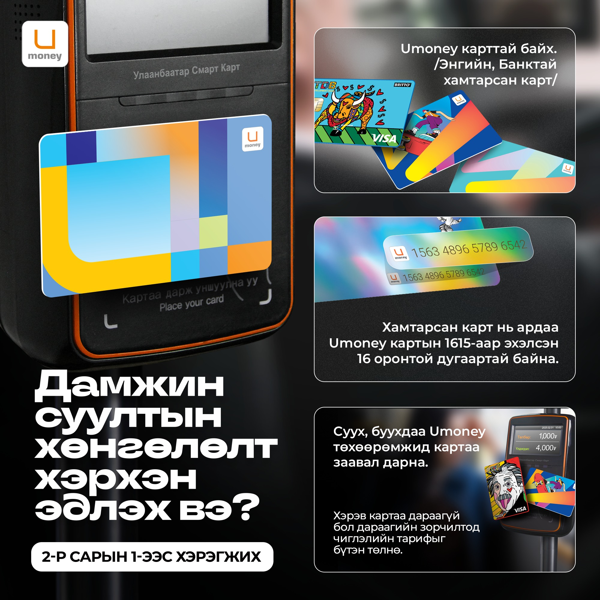 Нийтийн тээврийн бодлогын газраас нийтийн тээврээр зорчих программ, техникийг шинэчилж, бэлгэн болгожээ. Тиймээс нийтийн тээврээр зорчиход Улаанбаатар смарт карт унших төхөөрөмж болон бүх төрлийн арилжааны банкны карт унших төхөөрөмжүүд хэвийн ажиллана, гацахгүй. Гэхдээ банкны картаар дамжин суух үйлчлэхгүй. Дамжин суухын тулд зорчигч нийтийн тээврээс буухдаа картаа уншуулсан байх ёстой. Улаанбаатар смарт картыг биет болон биет бус хэлбэрээр борлуулна. Биет бус картыг “UBcard” апплейкэшн ашиглаж QR код хэлбэрээр ашиглана. Харин биет картыг Улаанбаатар хотод суурилуулж буй 100 киоск машинаар борлуулахаар тооцож, шинэчилжээ.