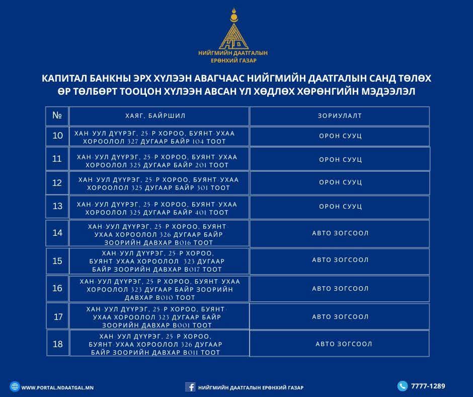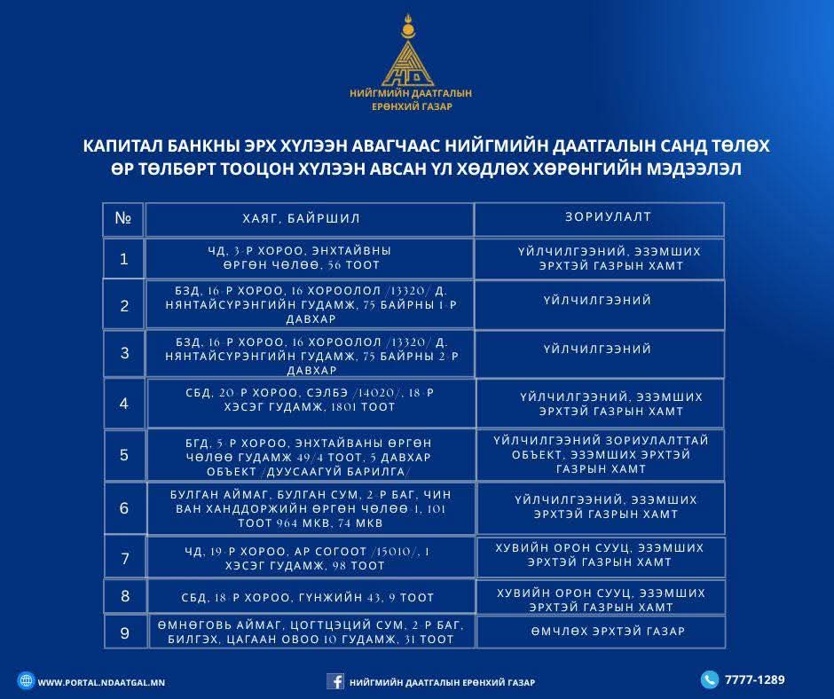 Капитал банкны нийгмийн даатгалын санд төлөгдөх өр төлбөрт тооцон авсан 18 байршилд байгаа 25 ширхэг үл хөдлөх хөрөнгийн жагсаалтыг та бүхэнд ил тод, нээлттэйгээр танилцуулж байна.