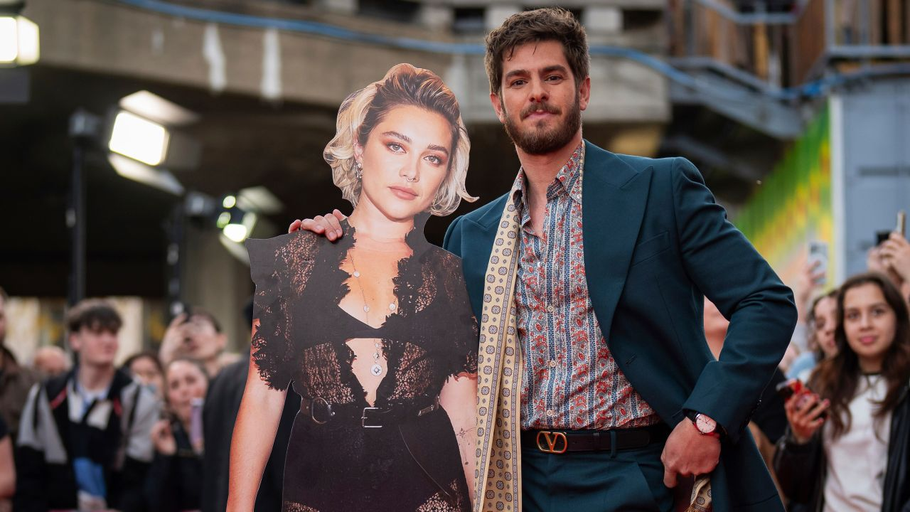 Эндрю Гарфилд жүжигчин Флоренс Фугийн картонон хайчилбарын хамт