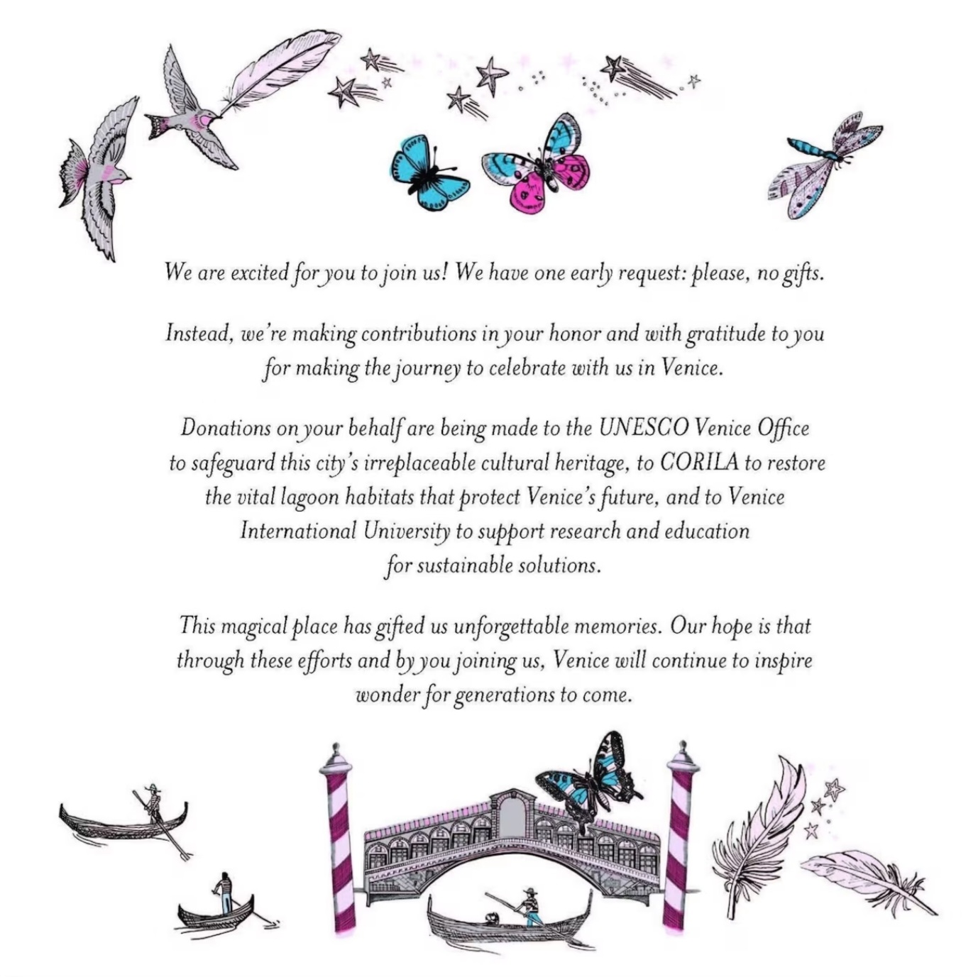 ABC News нь хуримын урилгын хэсгийг онцгой эрхтэйгээр олж авсан байна. Урилга тавдугаар сард илгээгдсэн бөгөөд зочдоос ямар нэгэн бэлэг өгөхөөс татгалзажээ. Оронд нь хосуудын нэрийн өмнөөс Венецийн гурван буяны байгууллагад хандив өгөх боломжийг санал болгосон байна.