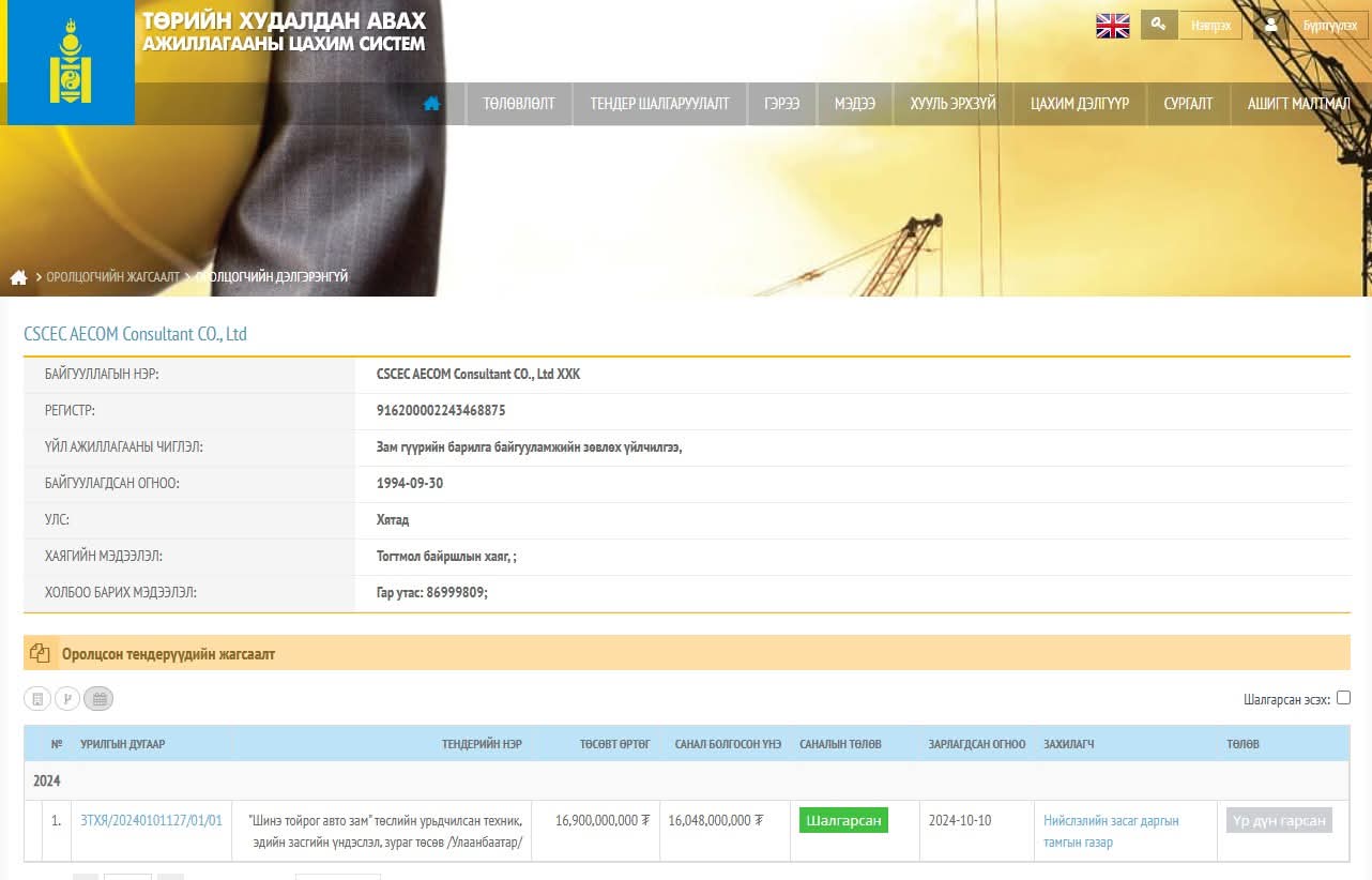 🛣1-р тойрог зам төсөл: ТЭЗҮ-г Хятад улсын "CSCEC AECOM CONSULTANTS CO., LTD" шалгарч гүйцэтгэсэн. (Эх сурвалж: opendataLab.mn)