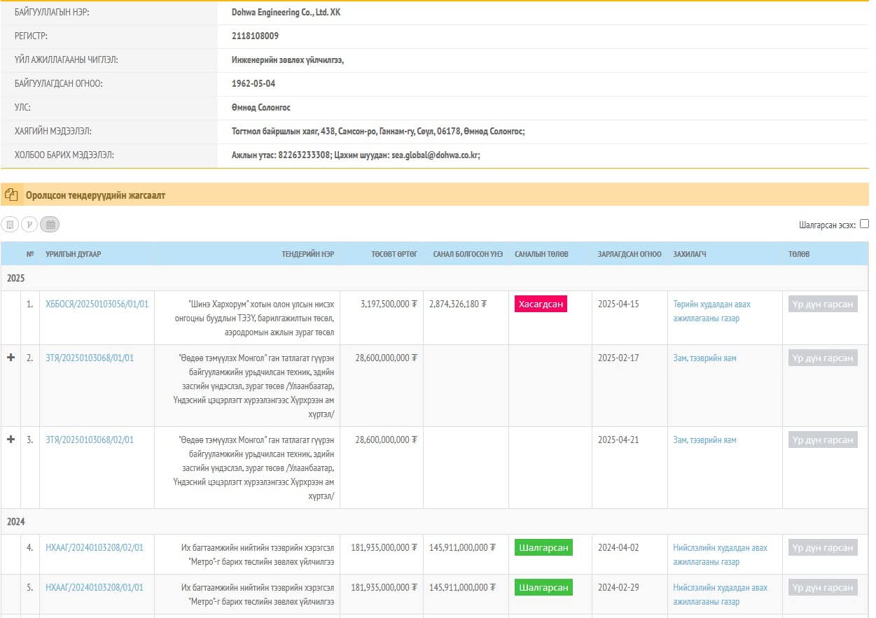 🚈Метроны төсөл: Зөвлөх үйлчилгээ болон ТЭЗҮ-г БНСУ-ын "DOHWA ENGINEERING CO., LTD" шалгарч гүйцэтгэж байна. (Эх сурвалж: tender.gov.mn)