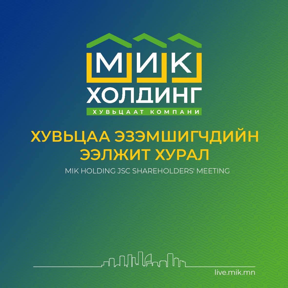 “МИК Холдинг” ХК-ийн Төлөөлөн удирдах зөвлөлийн тогтоолын дагуу компанийн Хувьцаа эзэмшигчдийн ээлжит хурал 2025 оны 4 дүгээр сарын 30-ны өдрийн компанийн өөрийн боловсруулан программыг ашиглан цахимаар хуралдлаа.