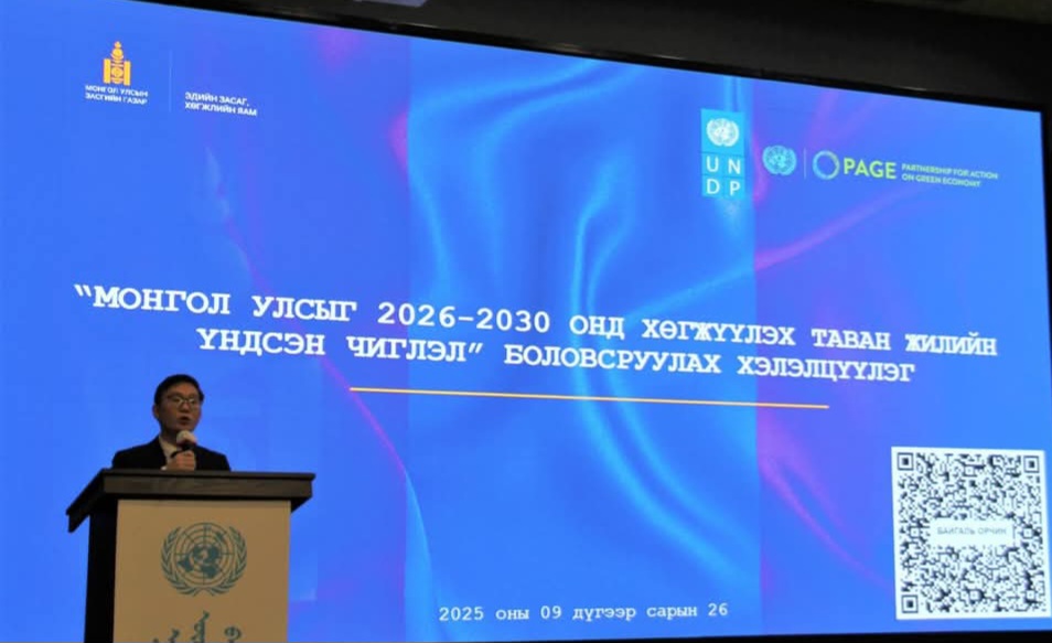 Байгаль орчин уур амьсгалын өөрчлөлтийн яам болон Эдийн засаг, хөгжлийн яам хамтран НҮБ-ын Хөгжлийн хөтөлбөрийн Ногоон эдийн засгийн төлөөх түншлэл (PAGE) санаачилгын дэмжлэгтэйгээр “Монгол Улсыг 2026-2030 онд хөгжүүлэх таван жилийн үндсэн чиглэл”-ийн төслийн Байгаль орчны бүлэгт санал авах олон талт хэлэлцүүлгийг өнөөдөр /2025.09.26/ зохион байгууллаа.