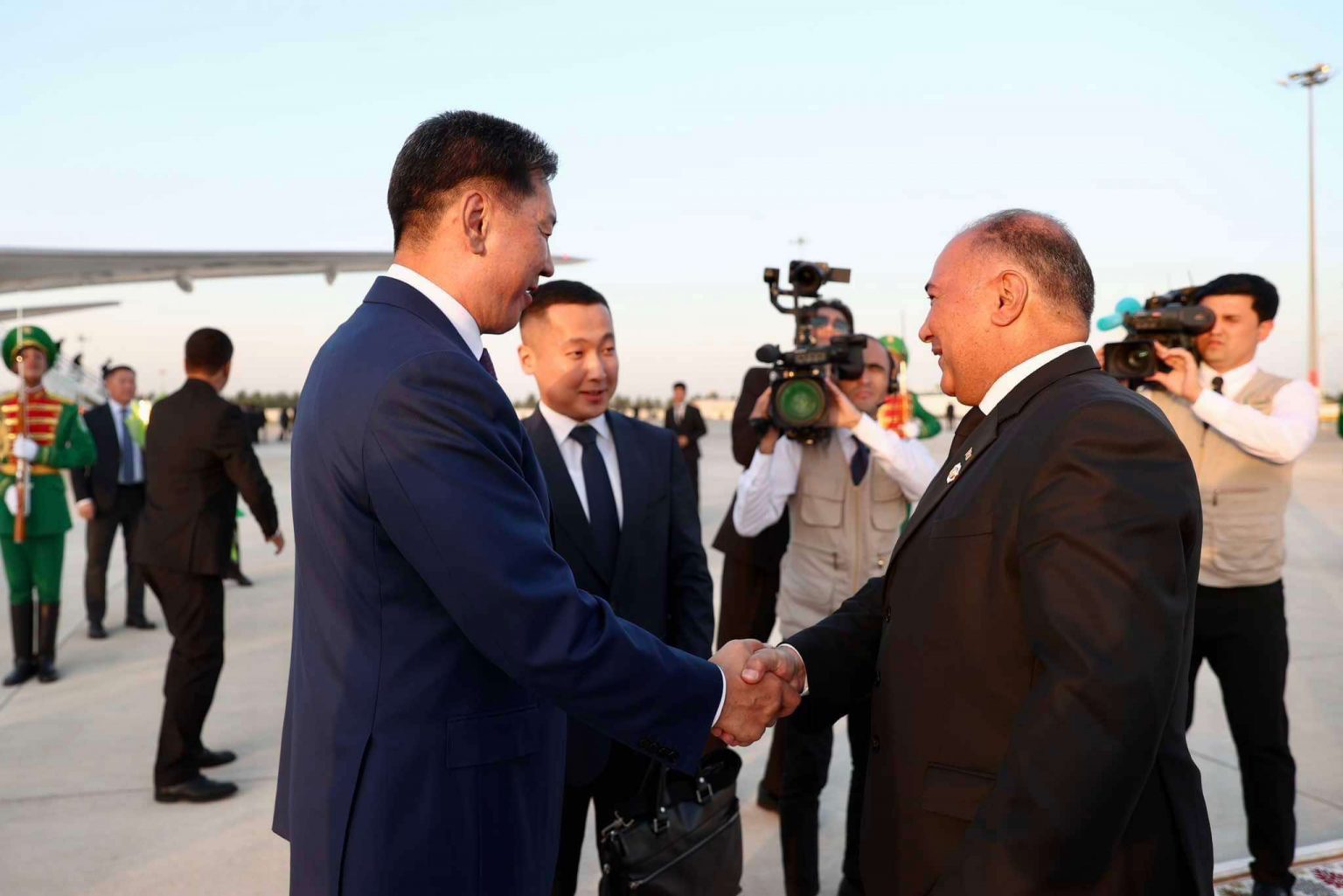 Ерөнхийлөгч Ухнаагийн Хүрэлсүх болон дагалдан яваа төлөөлөгчдийг Ашхабад хотын олон улсын нисэх онгоцны буудалд Туркменистан Улсын Шадар сайд, Засгийн газрын хэрэг эрхлэх газрын дэд дарга Батыр Атдаев тэргүүтэй албаны төлөөлөгчид угтан авав.