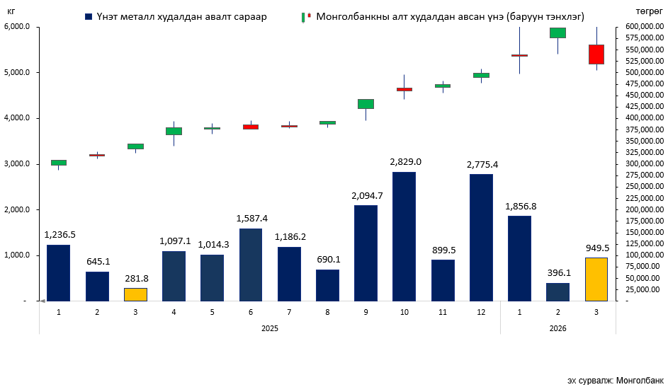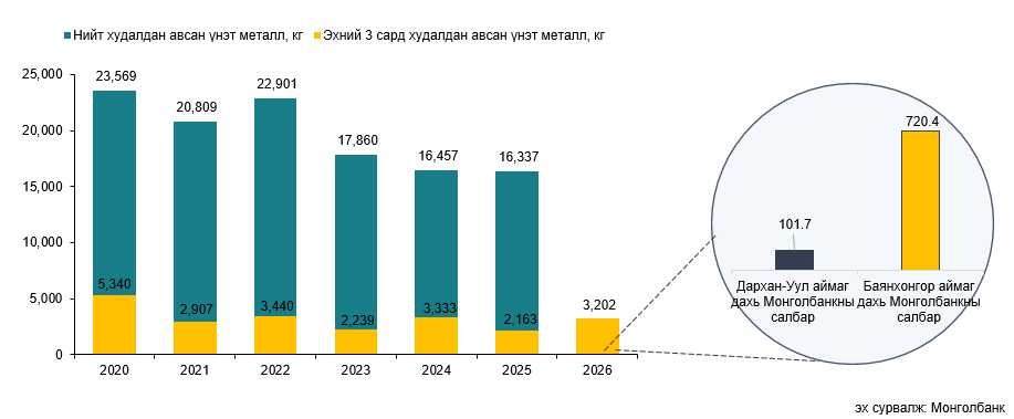 Монголбанк 2026 оны 3 дугаар сард 949.5 кг, оны эхнээс өссөн дүнгээр нийт 3.2 тонн үнэт металл, үүнээс Дархан-Уул аймаг дахь Монголбанкны салбар 101.7 кг, Баянхонгор аймаг дахь Монголбанкны салбар 720.4 кг үнэт металл худалдан авсан байна. Энэ нь өмнөх оны мөн үетэй харьцуулбал 48.0 хувиар өссөн үзүүлэлт байна.