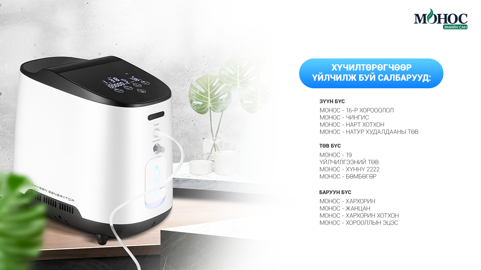 Монос эмийн сан Улаанбаатар хотын 3 бүст “Хүчилтөрөгчийн өрөө”-г байршуулж эхэллээ. Тус өрөөнд эх хүүхдийн хамт 45-60 минут суухад тархин дахь хүчилтөрөгчийн хэрэгцээг 100% хангах боломжтой болох юм.