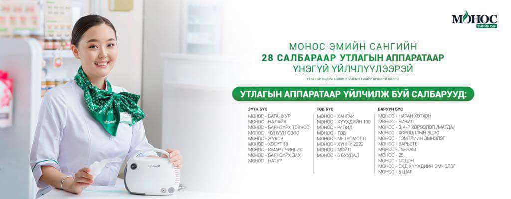Амьсгал шуугих, хуурай болон цэртэй ханиалгах, гуурсан хоолойн үрэвслийн үед утлага эмчилгээ үр дүнтэй байдаг. Монос эмийн сан нь 2018 оноос эхлэн өрхийн эмнэлгийн ачааллыг бууруулах, хүйтний үед ард иргэдэд хүртээмжийг ихэсгэх зорилгоор 60 гаруй салбараар “Утлагын аппарат”-аар үйлчилж эхэлсэн ба та дараах салбаруудаар үнэ төлбөргүй үйлчлүүлэх боломжтой юм.