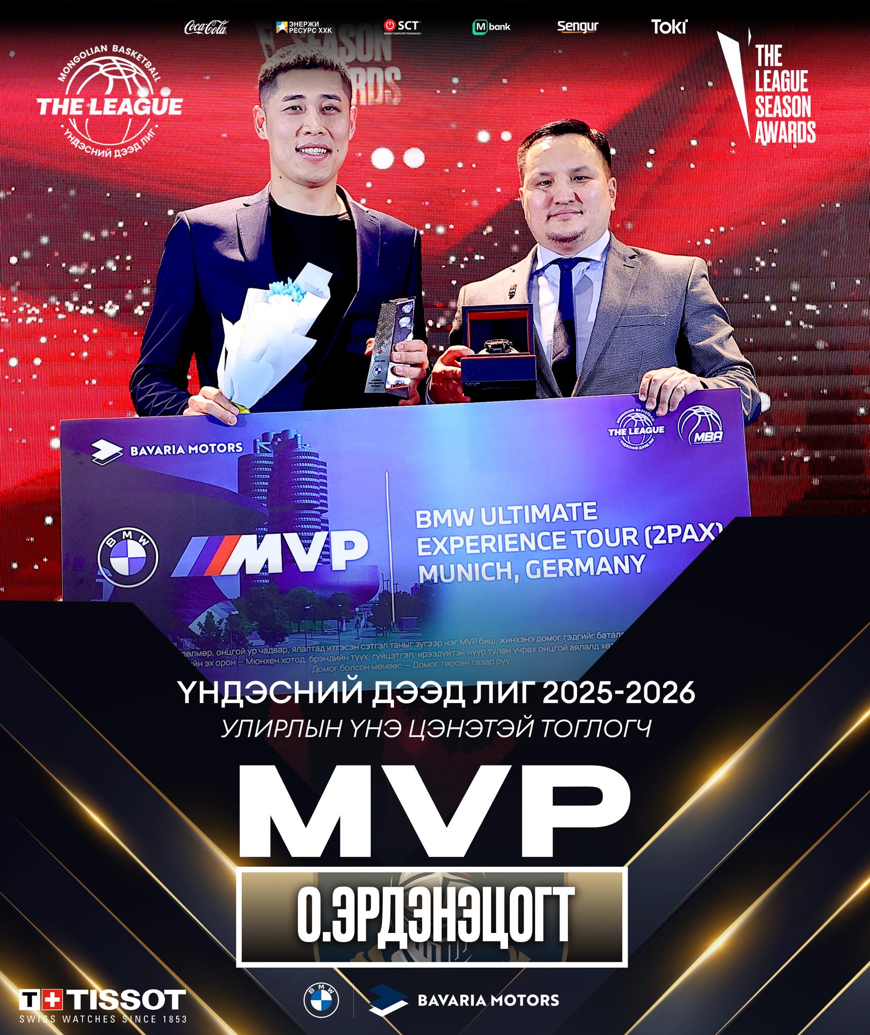 О.Эрдэнэцогт Үндэсний Дээд Лигийн 2025-2026 оны улирлын 27 тоглолтод оролцохдоо 13.9 оноо 4.9 самбар 5.9 оновчтой дамжуулалт 1.6 бөмбөг таслалт 84% чөлөөт шидэлтийн гүйцэтгэл гэсэн статистикыг үзүүлжээ.