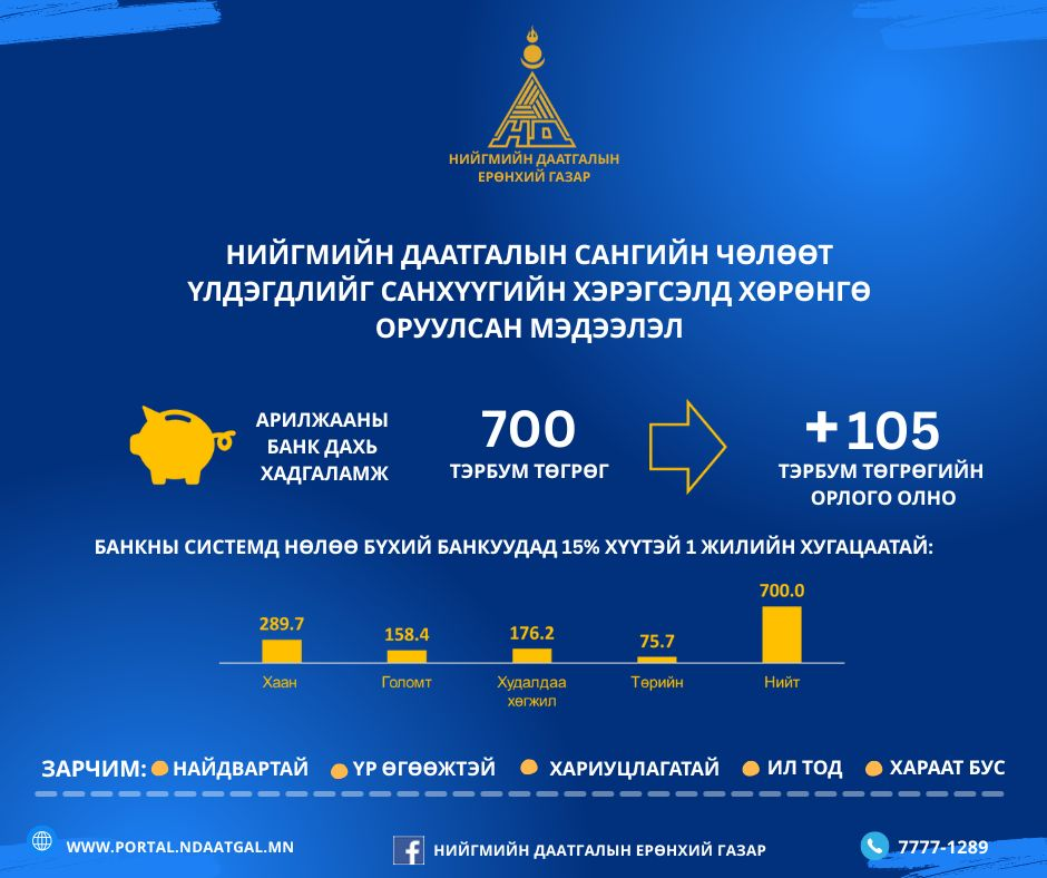 Нийгмийн даатгалын ерөнхий газар арилжааны банканд мөнгөн хадгаламж байршуулах тооцоолол хийж Нийгмийн даатгалын үндэсний зөвлөлийн дэргэдэх орон тооны бус Мэргэжлийн хороо, Олон нийтийн хяналтын зөвлөлөөр хянуулж банкны системд нөлөө бүхий арилжааны 4 банканд нийгмийн даатгалын сангийн чөлөөт үлдэгдэл болох 700 тэрбум төгрөгийг нэг жилийн хугацаатай, жилийн 15 хувийн хүүтэйгээр мөнгөн хадгаламж хэлбэрээр байршуулсан.