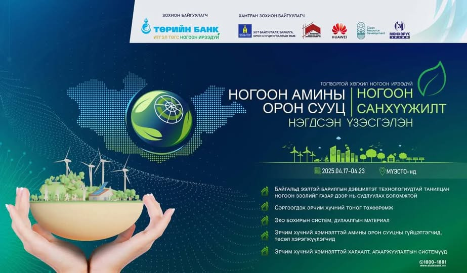 Ногоон амины орон сууцны нэгдсэн үзэсгэлэн болно. Тус үзэсгэлэнгийн үеэр эрчим хүчний хэмнэлттэй амины орон сууцны ногоон зээлийг газар дээр нь судлуулаад шуурхай шийдвэрүүлэх боломжийг олгоно. Та үзэсгэлэн худалдаанд хүрэлцэн ирснээр