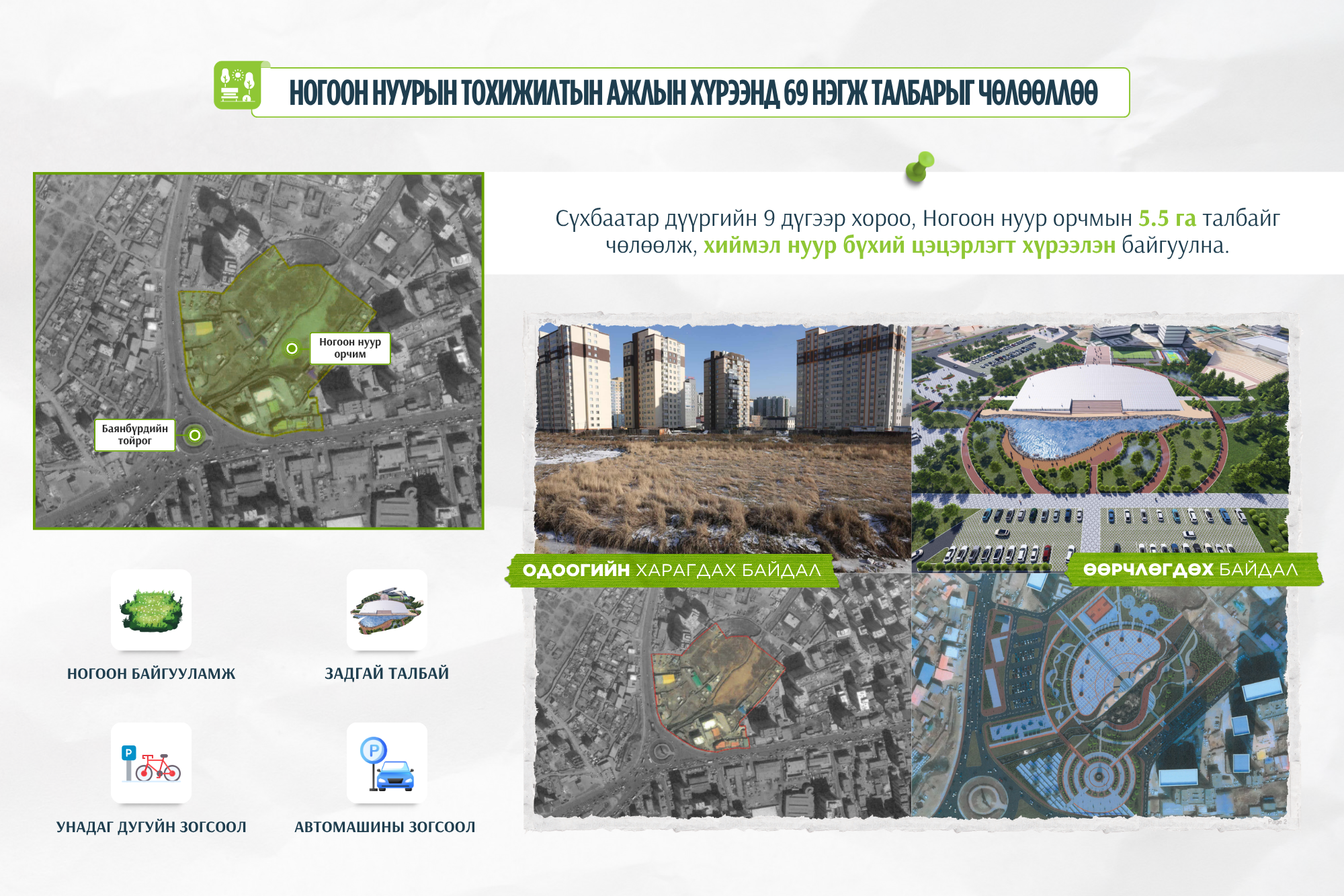 Сүхбаатар дүүргийн 9 дүгээр хороо, Ногоон нуур орчмын 5.5 га талбайд хиймэл нуур, ногоон байгууламж бүхий цэцэрлэгт хүрээлэн байгуулна. Төслөөр нийт 85 нэгж талбар чөлөөлөхөөс өнөөдрийн байдлаар 69 нэгж талбарыг чөлөөлөөд байгаа юм.